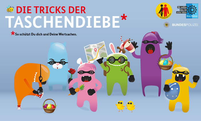 Die europaweite Kampagne „Stop Pickpockets“ der Bundespolizei zeigt, wie Sie sich schützen können Mit sechs kurzen Trickfilmen klärt sie zu den häufigsten Methoden der Taschendiebe auf. Diese werden von kleinen bunten Monstern dargestellt, getarnt als Blumenschenker, falsche Touristen, Stauerzeuger, Scheibenklopfer, Anrempler und Beschmutzer.