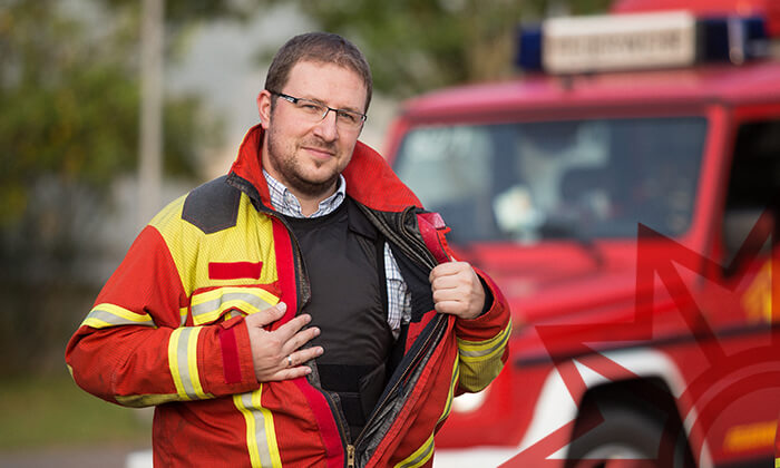 Danke an die Feuerwehr Gemeinde Laufach für das Foto. Zu sehen ist ein Kollege mit Schutzweste. Die Westen sind auf dem Vorausrüstwagen der Feuerwehr Laufach, welcher das Haupteinsatzfahrzeug bei First-Responder-Einsätzen ist sowie i.d.R. als erstes Fahrzeug die Einsatzstelle anfährt, verlastet.