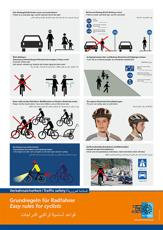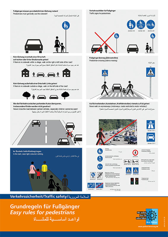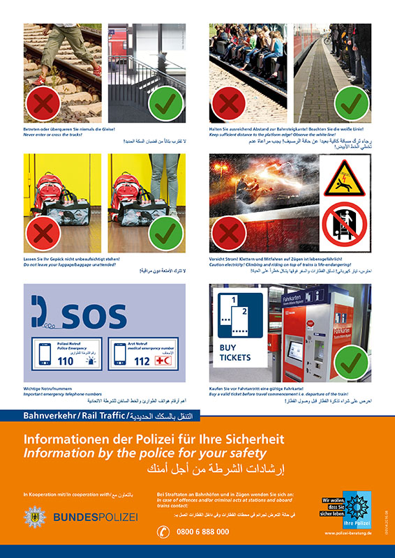 Der Plakatsatz umfasst drei Plakate in den Sprachen deutsch, englisch und arabisch. Auf je einem Plakat werden richtiges Verhalten im Schienenverkehr, die wichtigsten Verkehrsregeln für Fußgänger sowie die wichtigsten Verkehrsregeln für Radfahrer dargestellt.