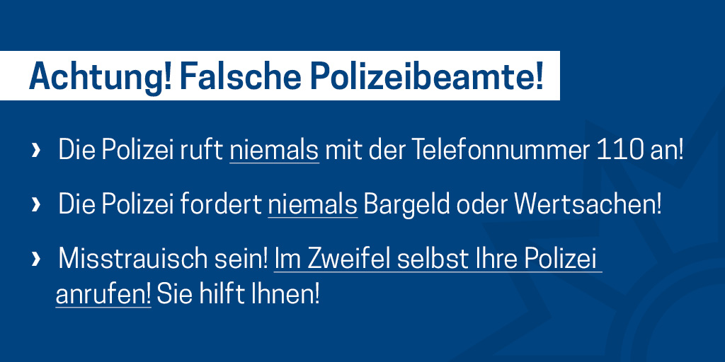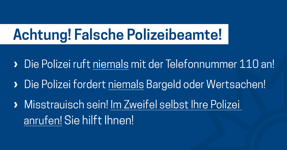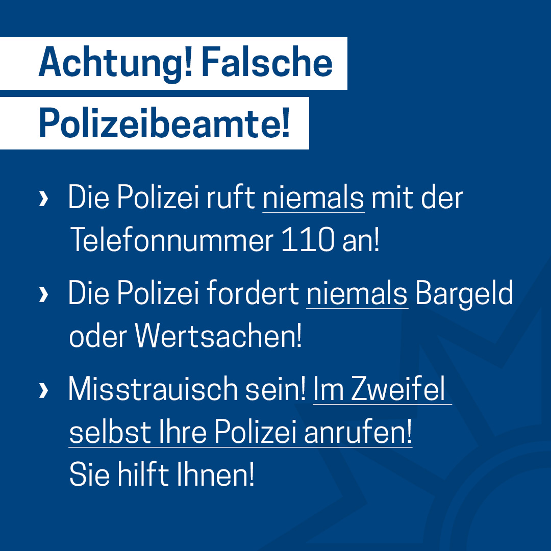 Das Medienpaket „Falsche Polizisten / Falsche Polizeibeamte Variante 1“ ist eine thematische Zusammenstellung aus Bild- und/ oder Textpostings für die Social Media Kanäle Facebook, Instagram und X. Wir stellen Ihnen die Beiträge zur freien Verfügung bereit. Nutzen Sie diese selbst oder leiten Sie die Postings an Ihre zuständige Social Media Stelle weiter. Wie und ob Sie die Beiträge veröffentlichen, können Sie individuell entscheiden. Texte und Hashtags können Sie frei nutzen und für Ihre Anforderungen anpassen.