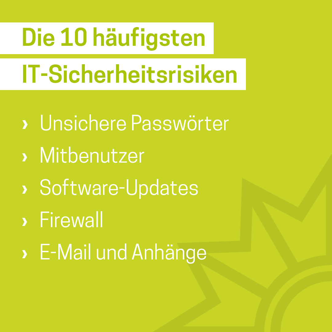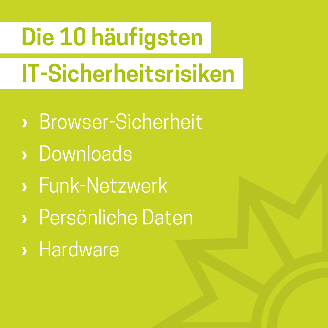 Das Medienpaket „Die 10 häufigsten IT-Sicherheitsrisiken“ ist eine thematische Zusammenstellung aus Bild- und/ oder Textpostings für die Social Media Kanäle Facebook, Instagram und X. Wir stellen Ihnen die Beiträge zur freien Verfügung bereit. Nutzen Sie diese selbst oder leiten Sie die Postings an Ihre zuständige Social Media Stelle weiter. Wie und ob Sie die Beiträge veröffentlichen, können Sie individuell entscheiden. Texte und Hashtags können Sie frei nutzen und für Ihre Anforderungen anpassen.