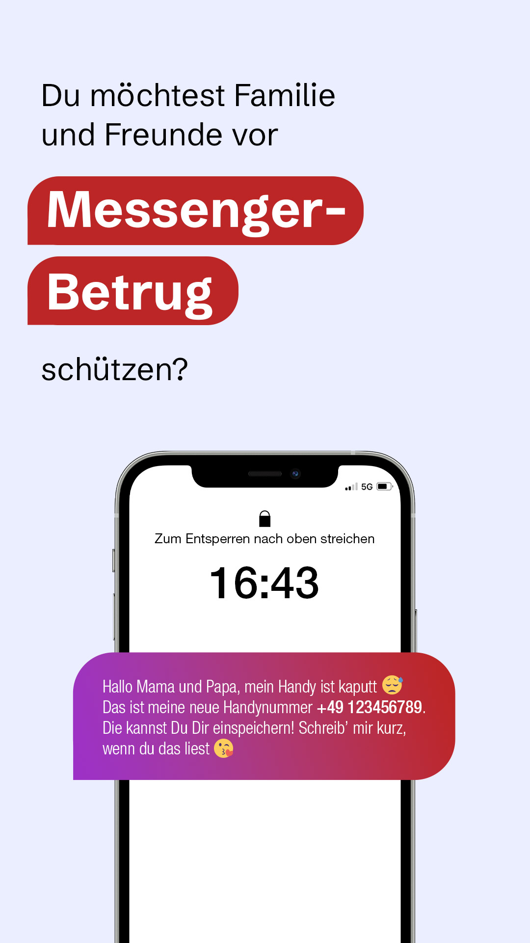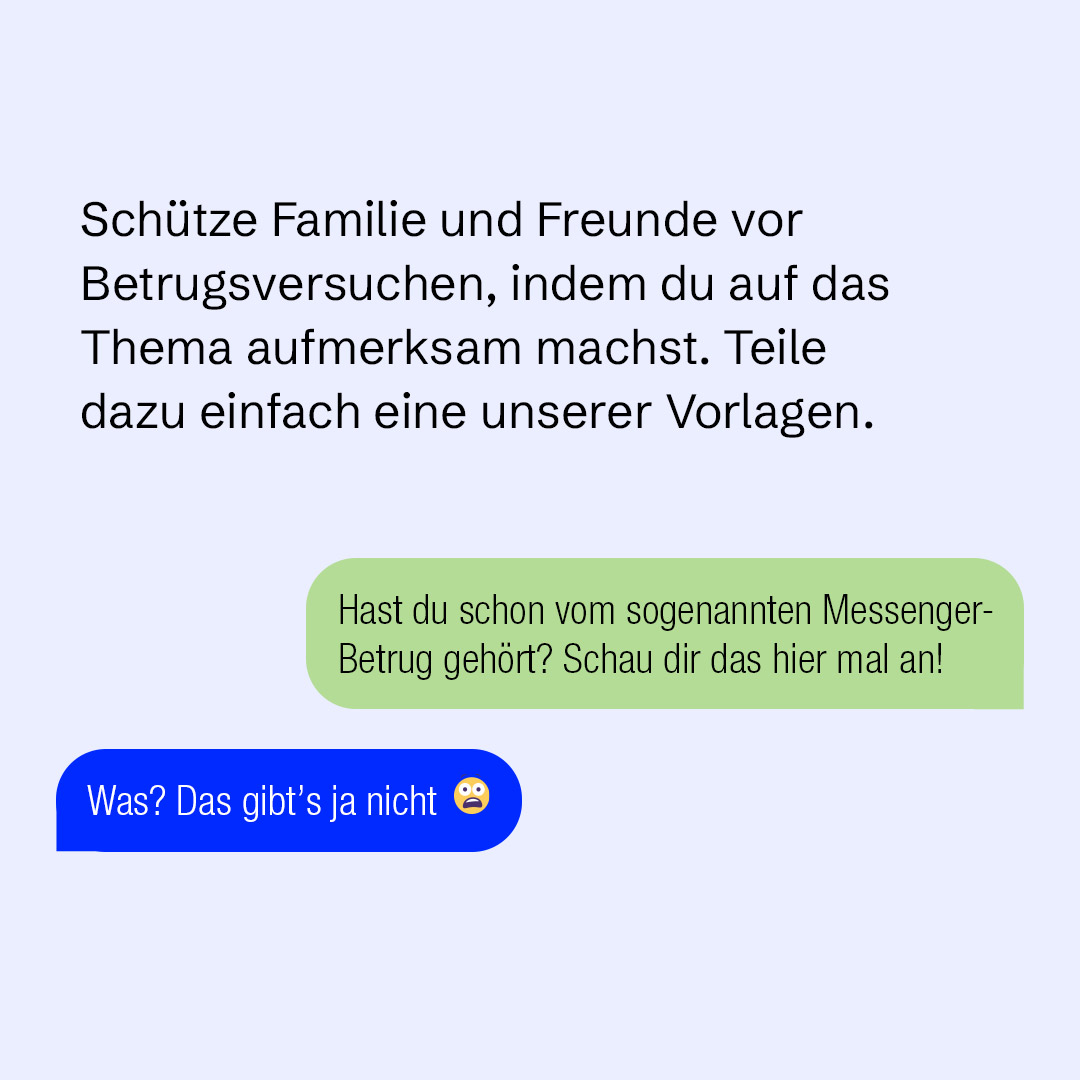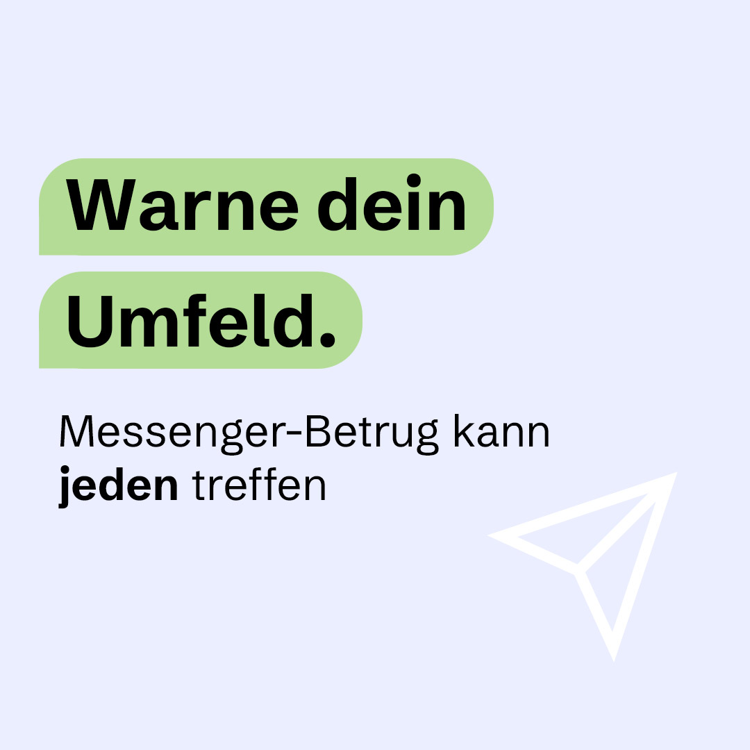 Das Medienpaket „Messenger-Betrug: Warne Dein Umfeld“ ist eine thematische Zusammenstellung aus Bild- und/ oder Textpostings für die Social Media Kanäle Facebook, Instagram und X. Wir stellen Ihnen die Beiträge zur freien Verfügung bereit. Nutzen Sie diese selbst oder leiten Sie die Postings an Ihre zuständige Social Media Stelle weiter. Wie und ob Sie die Beiträge veröffentlichen, können Sie individuell entscheiden. Texte und Hashtags können Sie frei nutzen und für Ihre Anforderungen anpassen.