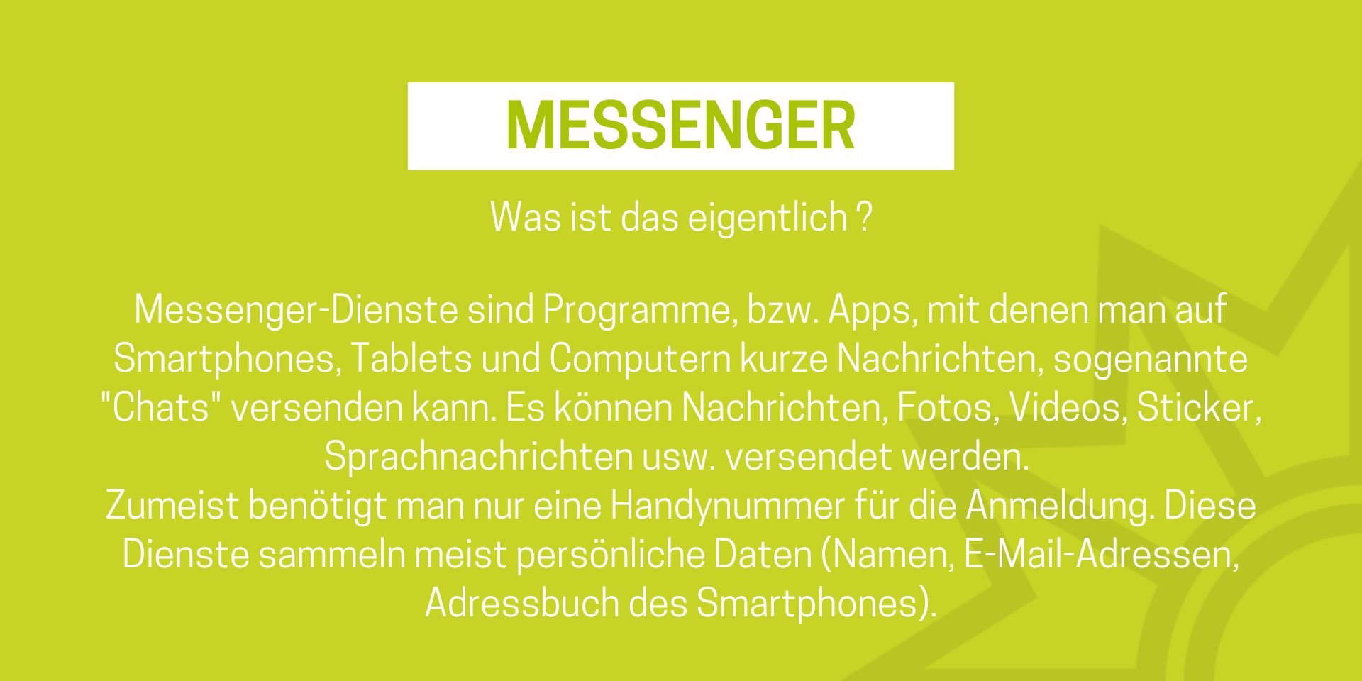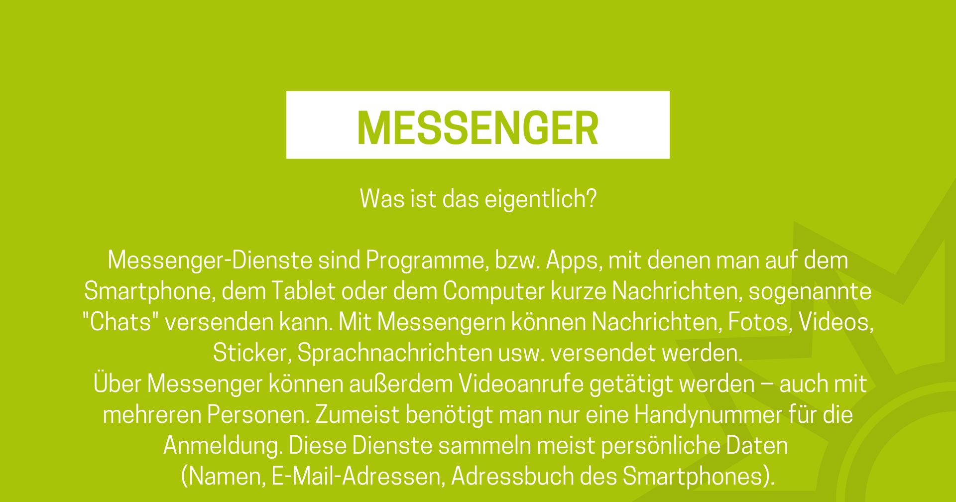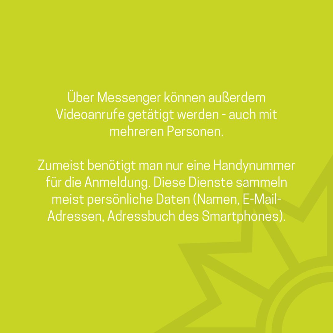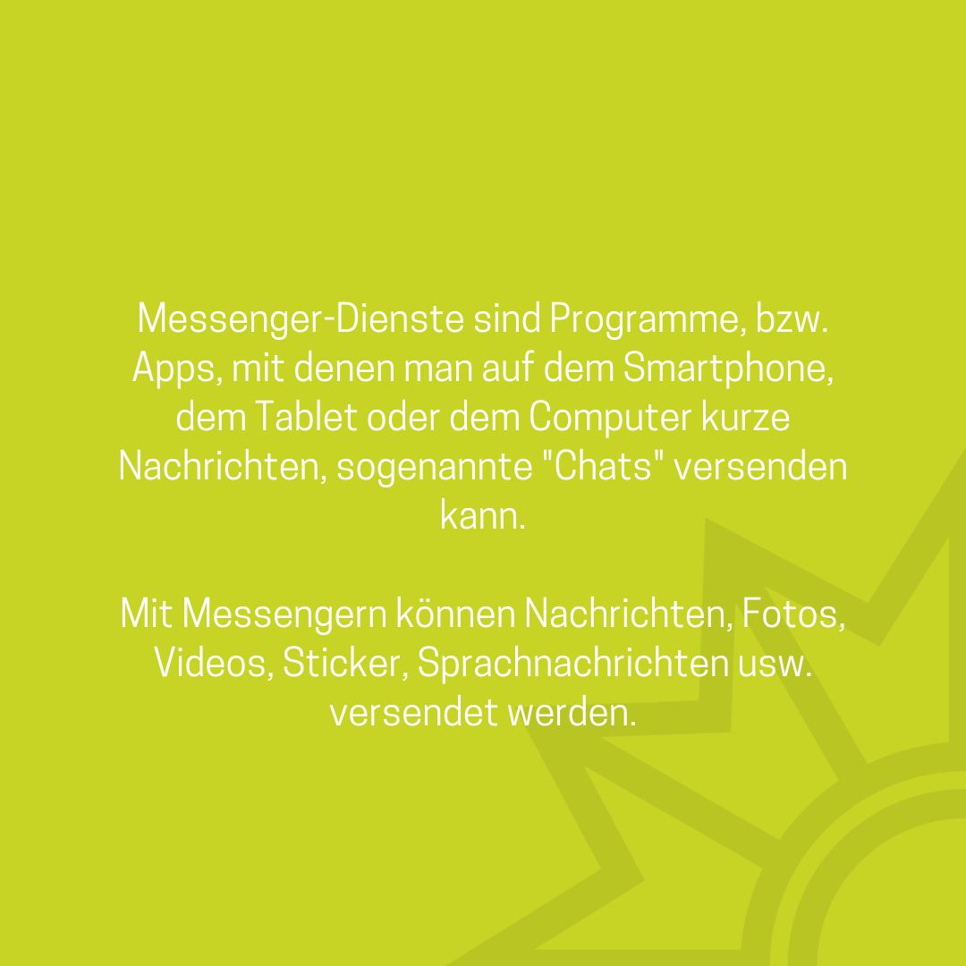 Das Medienpaket „Messenger: Was ist das eigentlich?“ ist eine thematische Zusammenstellung aus Bild- und/ oder Textpostings für die Social Media Kanäle Facebook, Instagram und X. Wir stellen Ihnen die Beiträge zur freien Verfügung bereit. Nutzen Sie diese selbst oder leiten Sie die Postings an Ihre zuständige Social Media Stelle weiter. Wie und ob Sie die Beiträge veröffentlichen, können Sie individuell entscheiden. Texte und Hashtags können Sie frei nutzen und für Ihre Anforderungen anpassen.