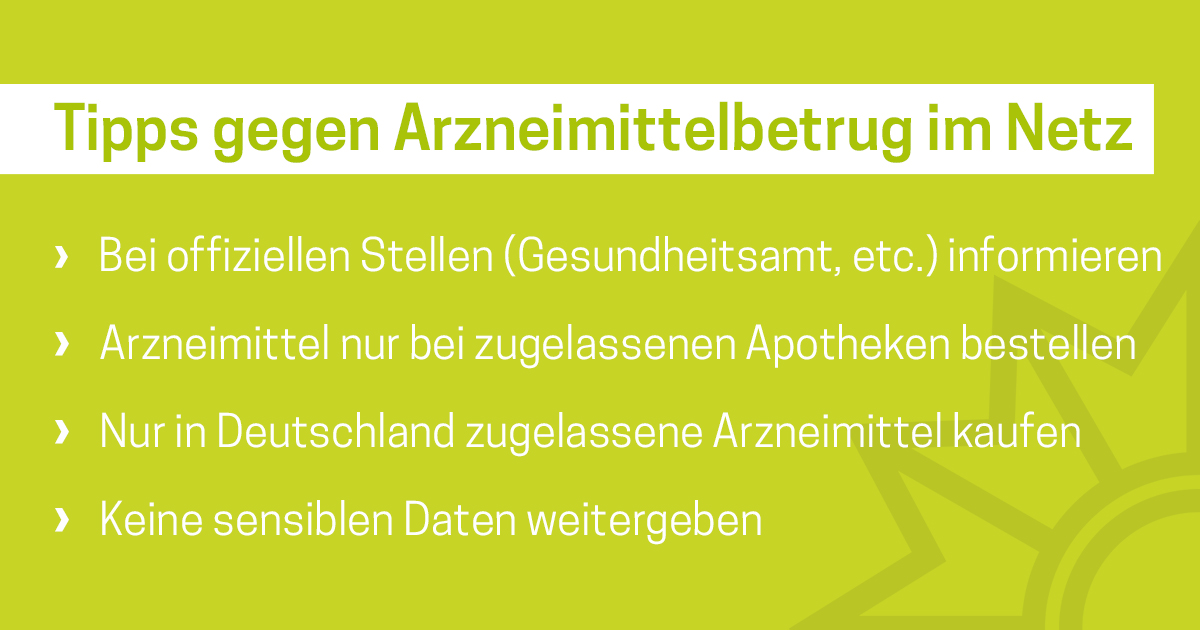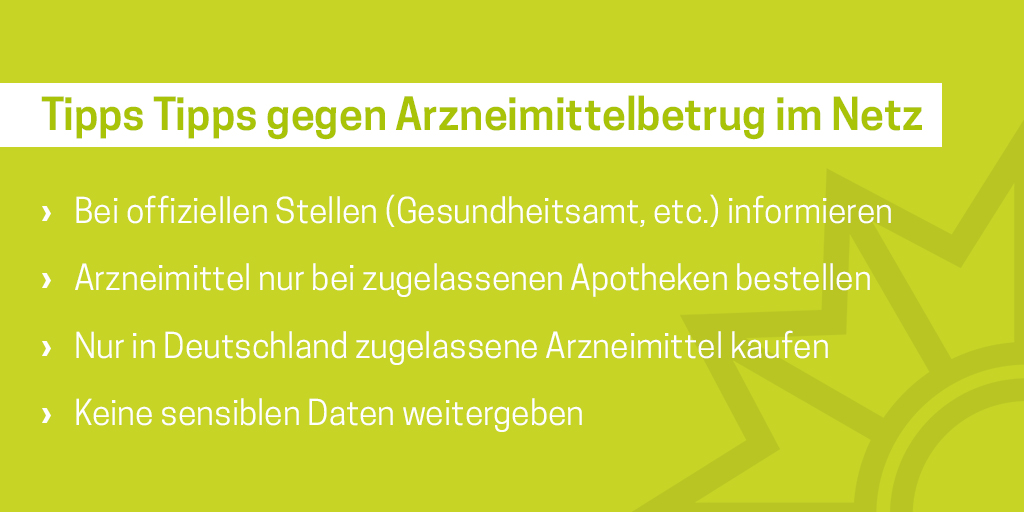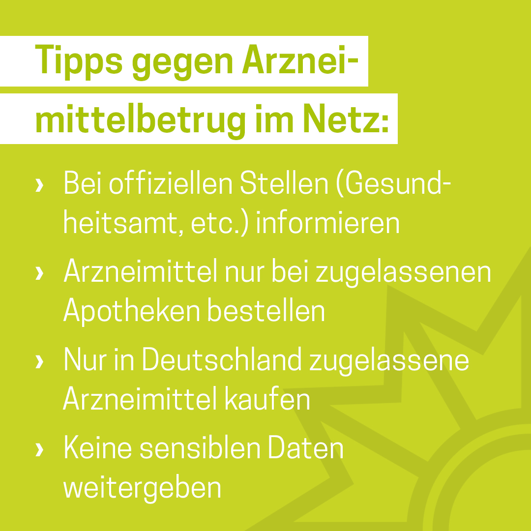 Das Medienpaket „Tipps gegen Arzneimittelbetrug im Netz“ ist eine thematische Zusammenstellung aus Bild- und/ oder Textpostings für die Social Media Kanäle Facebook, Instagram und X. Wir stellen Ihnen die Beiträge zur freien Verfügung bereit. Nutzen Sie diese selbst oder leiten Sie die Postings an Ihre zuständige Social Media Stelle weiter. Wie und ob Sie die Beiträge veröffentlichen, können Sie individuell entscheiden. Texte und Hashtags können Sie frei nutzen und für Ihre Anforderungen anpassen.