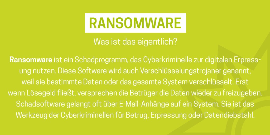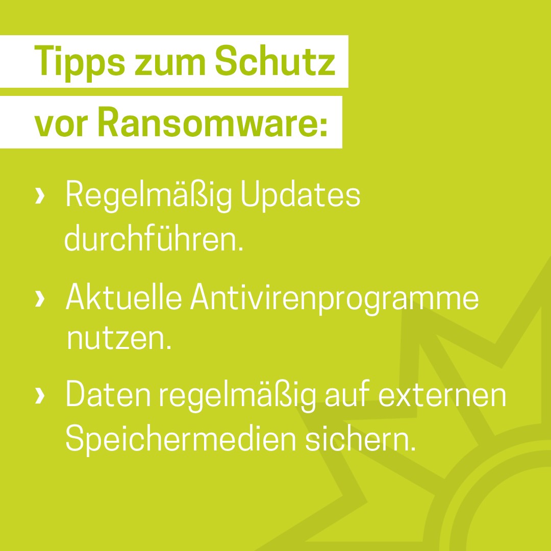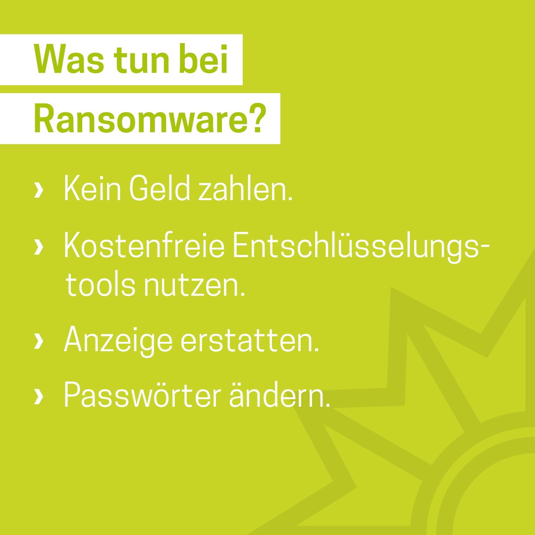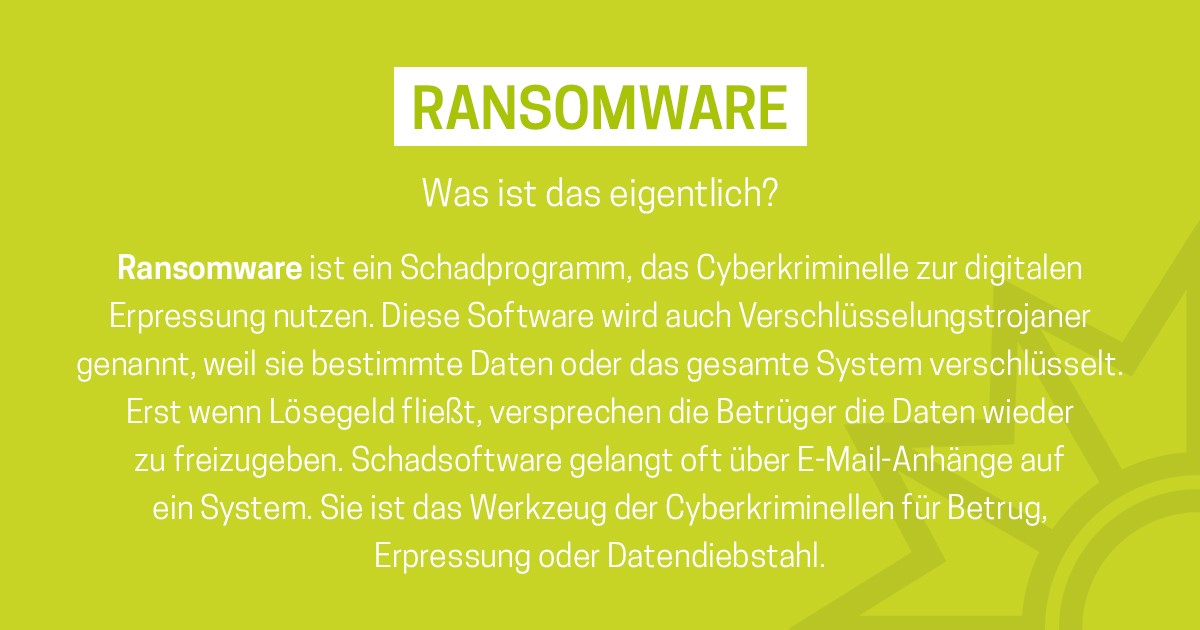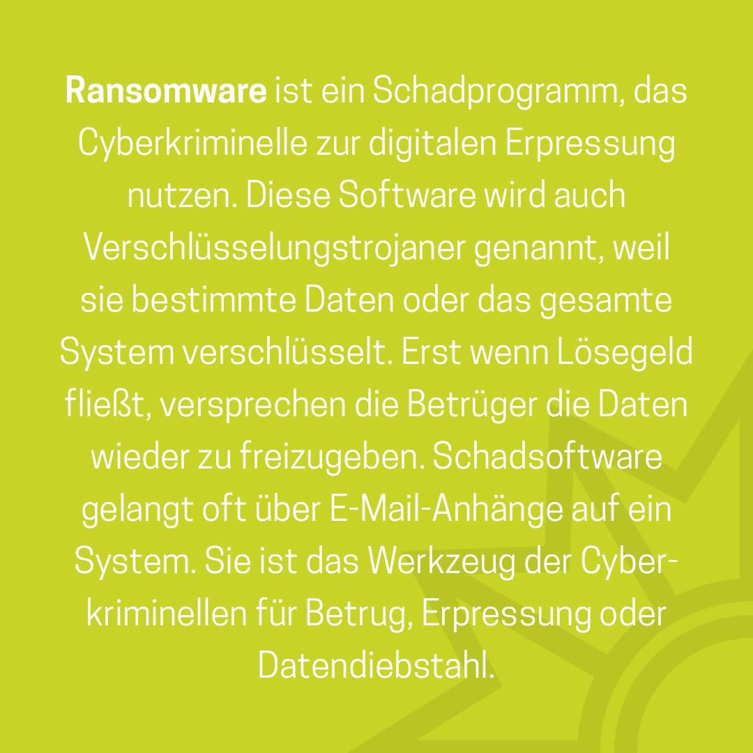 Das Medienpaket „Was ist eigentlich Ransomware?“ ist eine thematische Zusammenstellung aus Bild- und/ oder Textpostings für die Social Media Kanäle Facebook, Instagram und X. Wir stellen Ihnen die Beiträge zur freien Verfügung bereit. Nutzen Sie diese selbst oder leiten Sie die Postings an Ihre zuständige Social Media Stelle weiter. Wie und ob Sie die Beiträge veröffentlichen, können Sie individuell entscheiden. Texte und Hashtags können Sie frei nutzen und für Ihre Anforderungen anpassen.