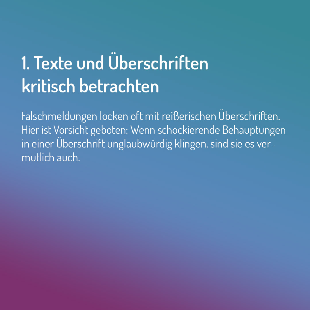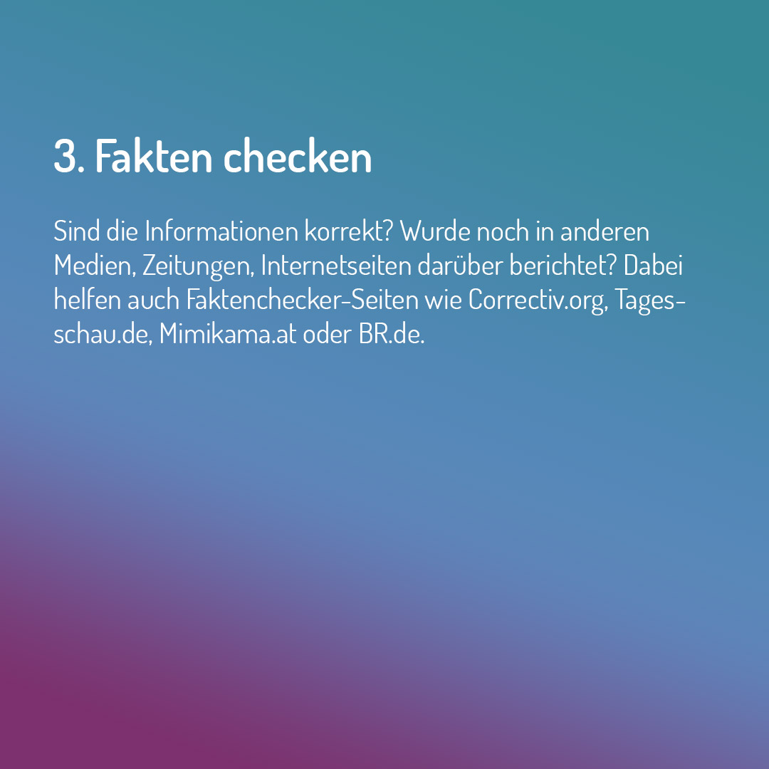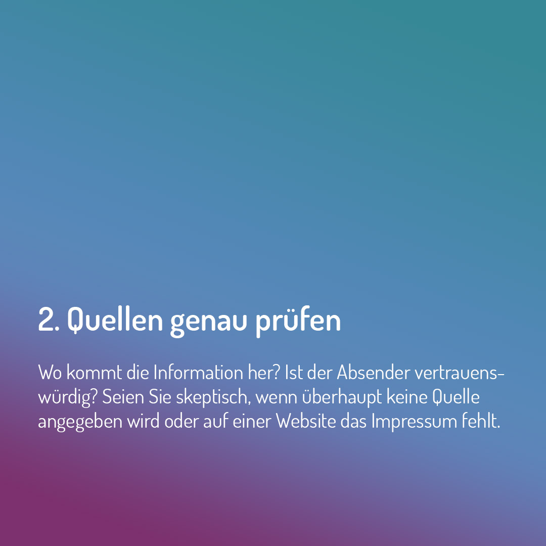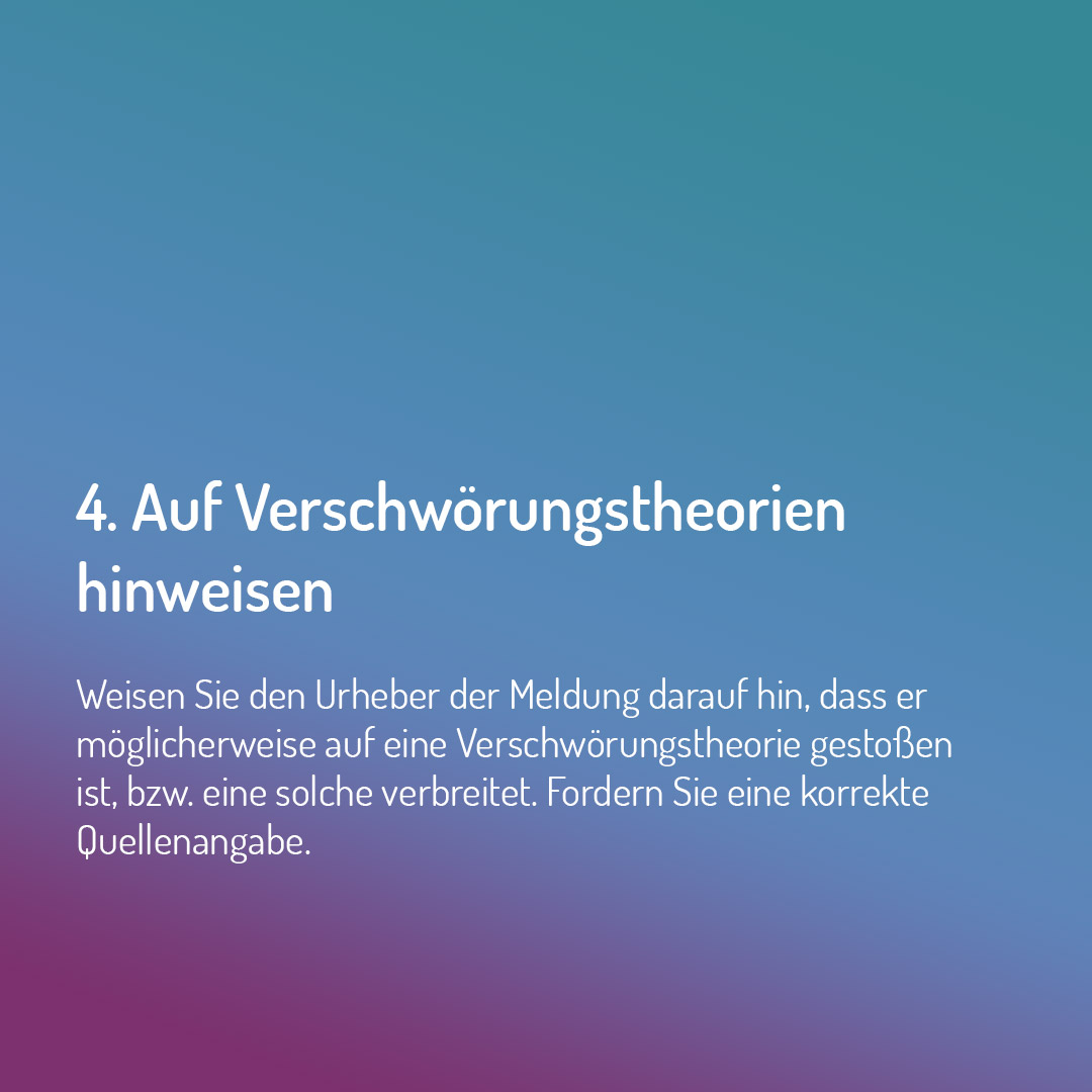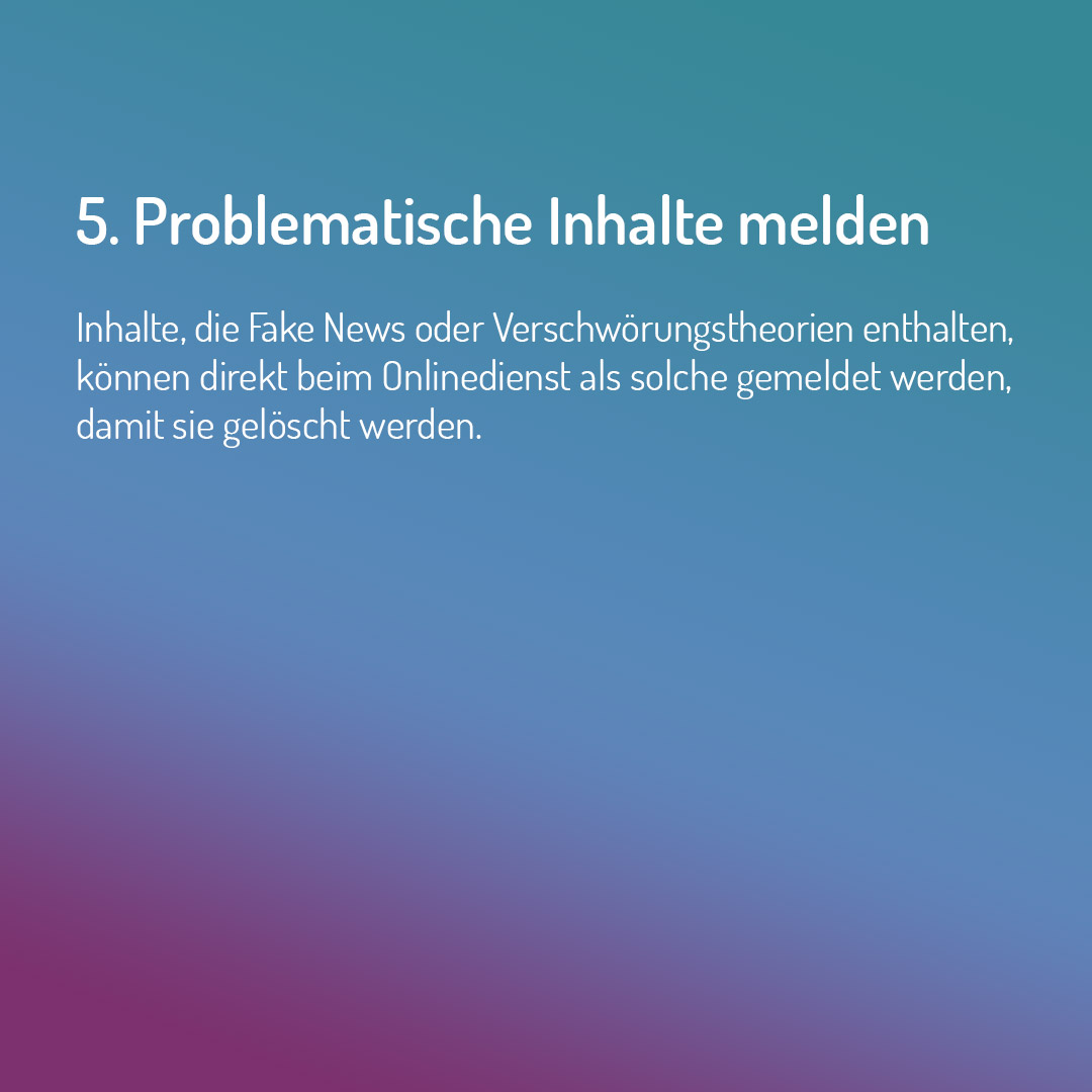 Das Medienpaket „Fünf Tipps zum Umgang mit Verschwörungsmythen“ ist eine thematische Zusammenstellung aus Bild- und/ oder Textpostings für die Social Media Kanäle Facebook, Instagram und X. Wir stellen Ihnen die Beiträge zur freien Verfügung bereit. Nutzen Sie diese selbst oder leiten Sie die Postings an Ihre zuständige Social Media Stelle weiter. Wie und ob Sie die Beiträge veröffentlichen, können Sie individuell entscheiden. Texte und Hashtags können Sie frei nutzen und für Ihre Anforderungen anpassen.