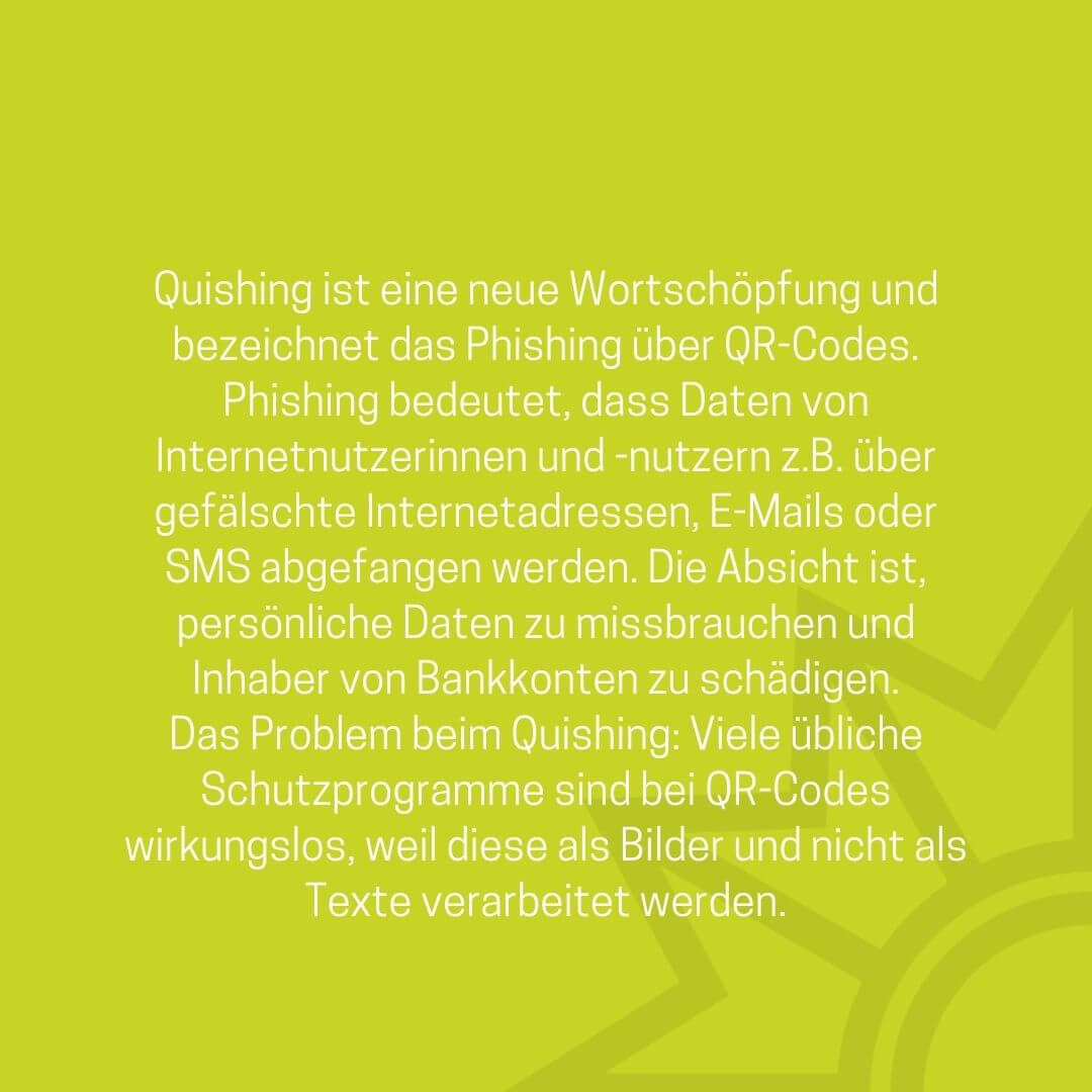 Das Medienpaket „Was ist Quishing?“ ist eine thematische Zusammenstellung aus Bild- und/ oder Textpostings für die Social Media Kanäle Facebook, Instagram und X. Wir stellen Ihnen die Beiträge zur freien Verfügung bereit. Nutzen Sie diese selbst oder leiten Sie die Postings an Ihre zuständige Social Media Stelle weiter. Wie und ob Sie die Beiträge veröffentlichen, können Sie individuell entscheiden. Texte und Hashtags können Sie frei nutzen und für Ihre Anforderungen anpassen.