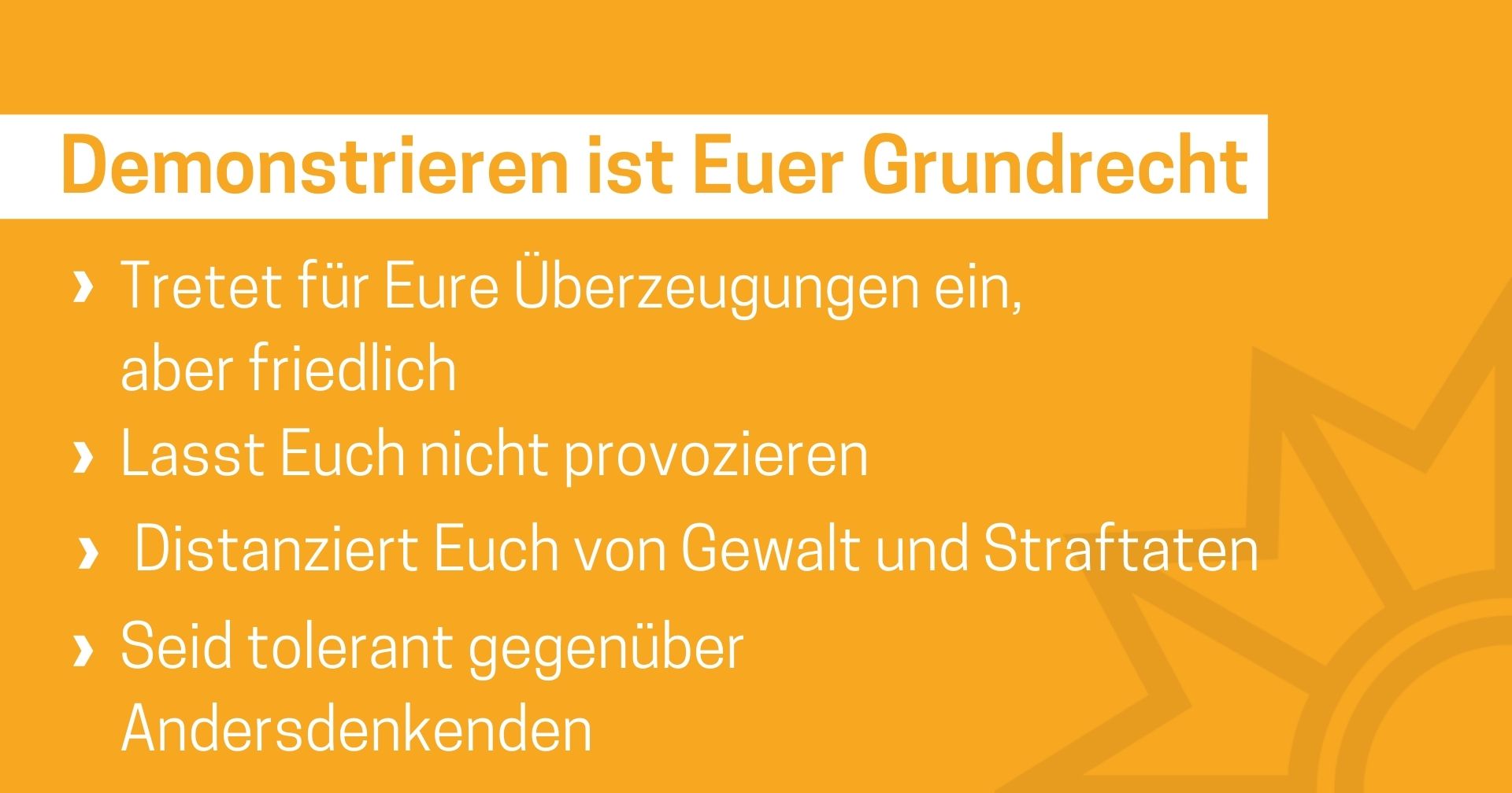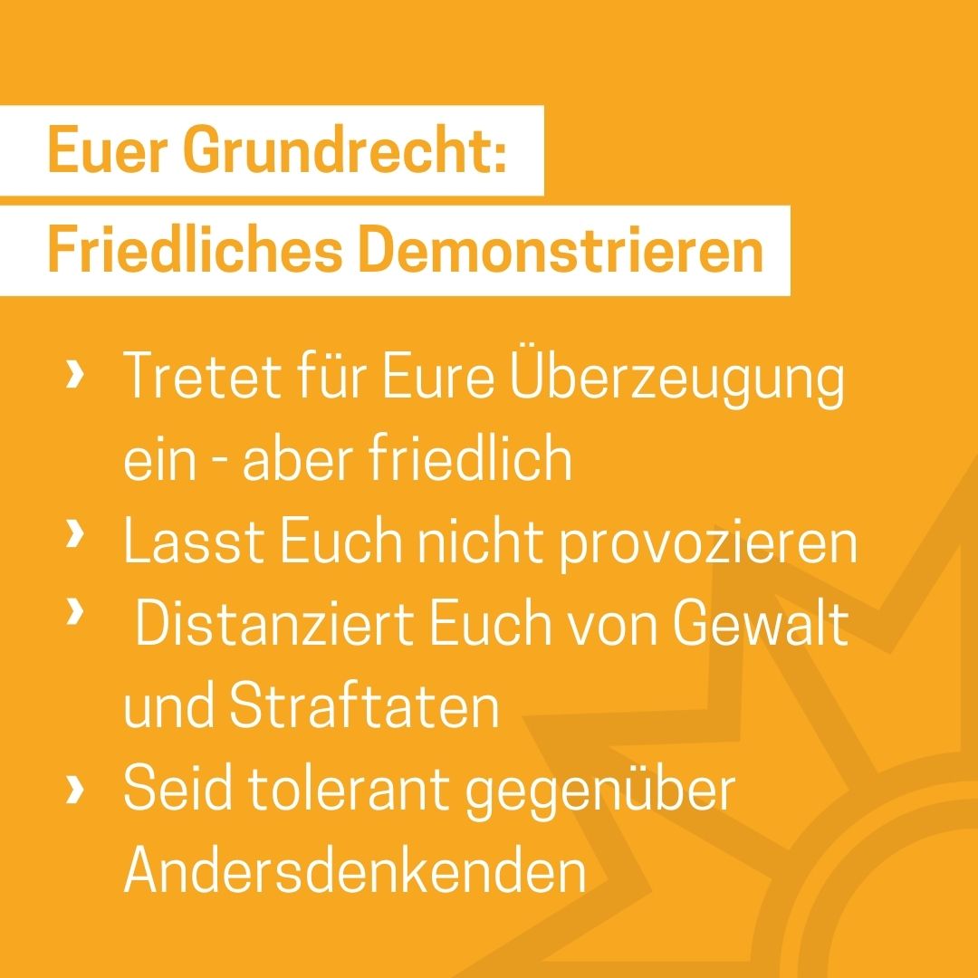 Das Medienpaket „Grundrecht: friedliches Demonstreieren“ ist eine thematische Zusammenstellung aus Bild- und/ oder Textpostings für die Social Media Kanäle Facebook, Instagram und X. Wir stellen Ihnen die Beiträge zur freien Verfügung bereit. Nutzen Sie diese selbst oder leiten Sie die Postings an Ihre zuständige Social Media Stelle weiter. Wie und ob Sie die Beiträge veröffentlichen, können Sie individuell entscheiden. Texte und Hashtags können Sie frei nutzen und für Ihre Anforderungen anpassen.