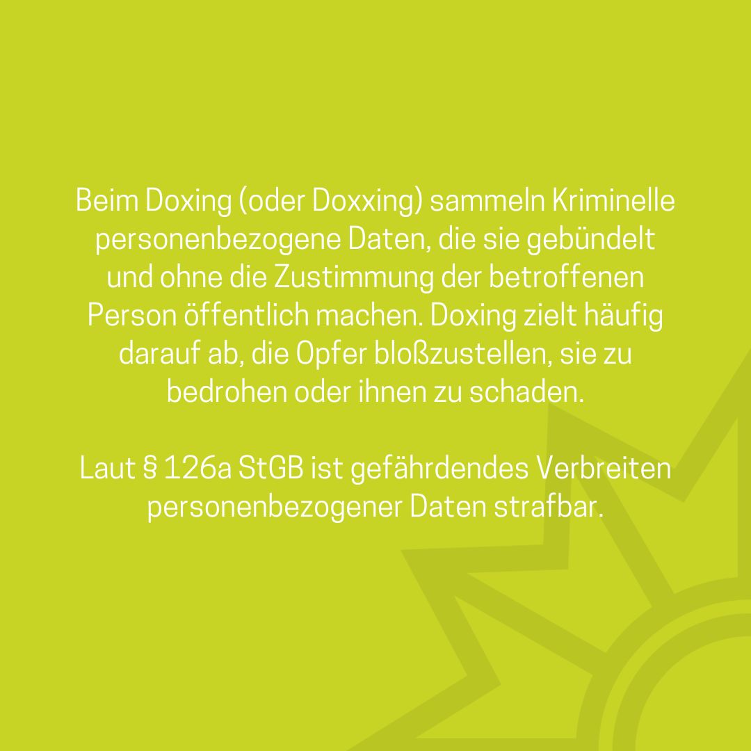Das Medienpaket „Doxing: Was ist das eigentlich?“ ist eine thematische Zusammenstellung aus Bild- und/ oder Textpostings für die Social Media Kanäle Facebook, Instagram und X. Wir stellen Ihnen die Beiträge zur freien Verfügung bereit. Nutzen Sie diese selbst oder leiten Sie die Postings an Ihre zuständige Social Media Stelle weiter. Wie und ob Sie die Beiträge veröffentlichen, können Sie individuell entscheiden. Texte und Hashtags können Sie frei nutzen und für Ihre Anforderungen anpassen.