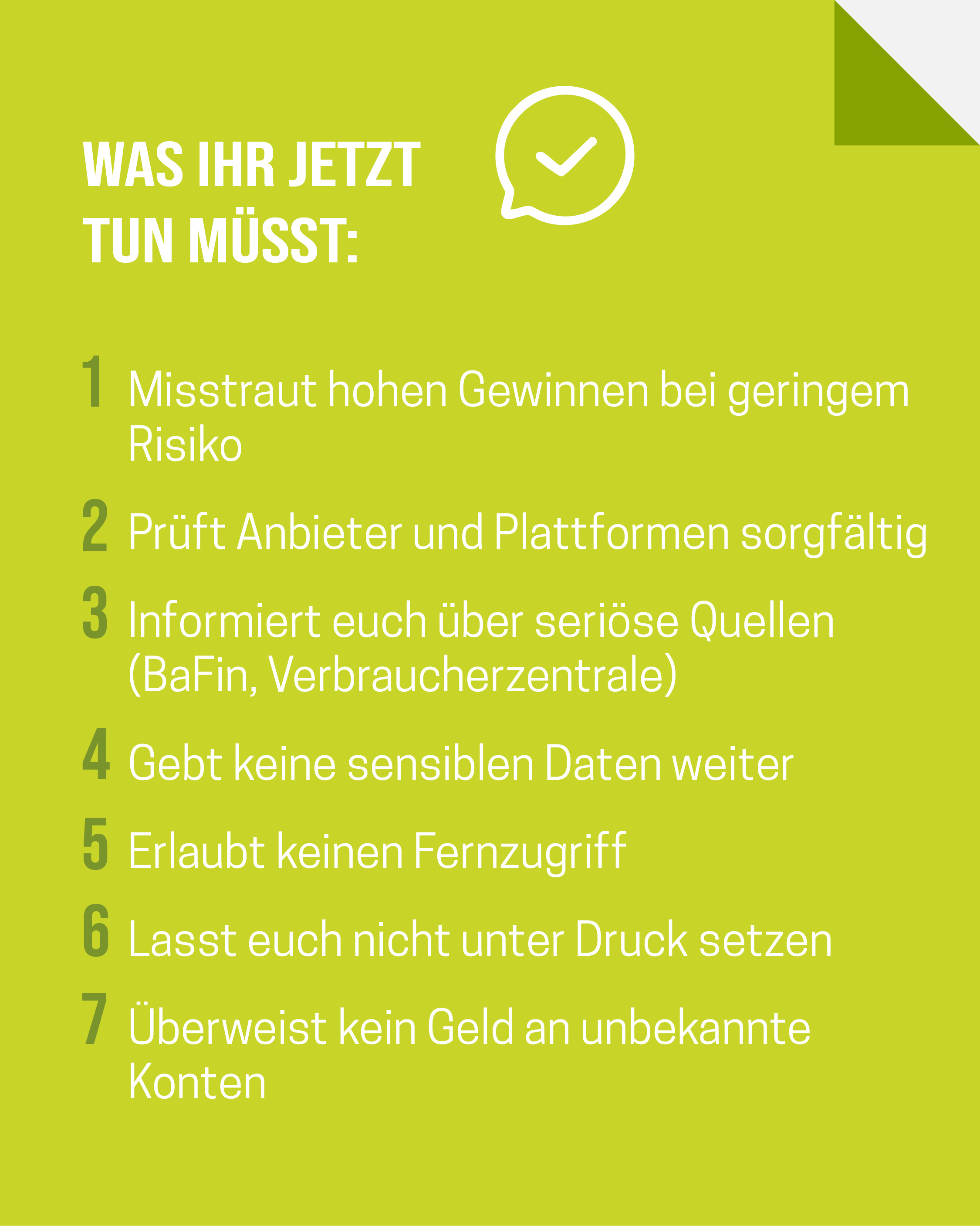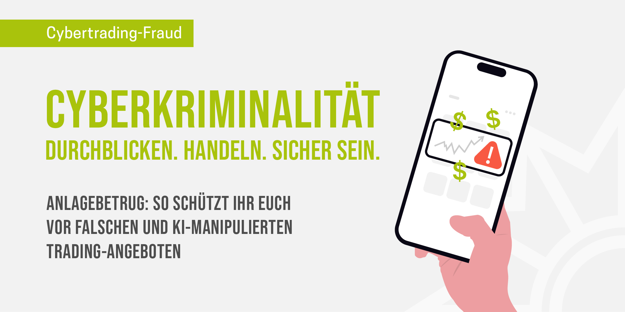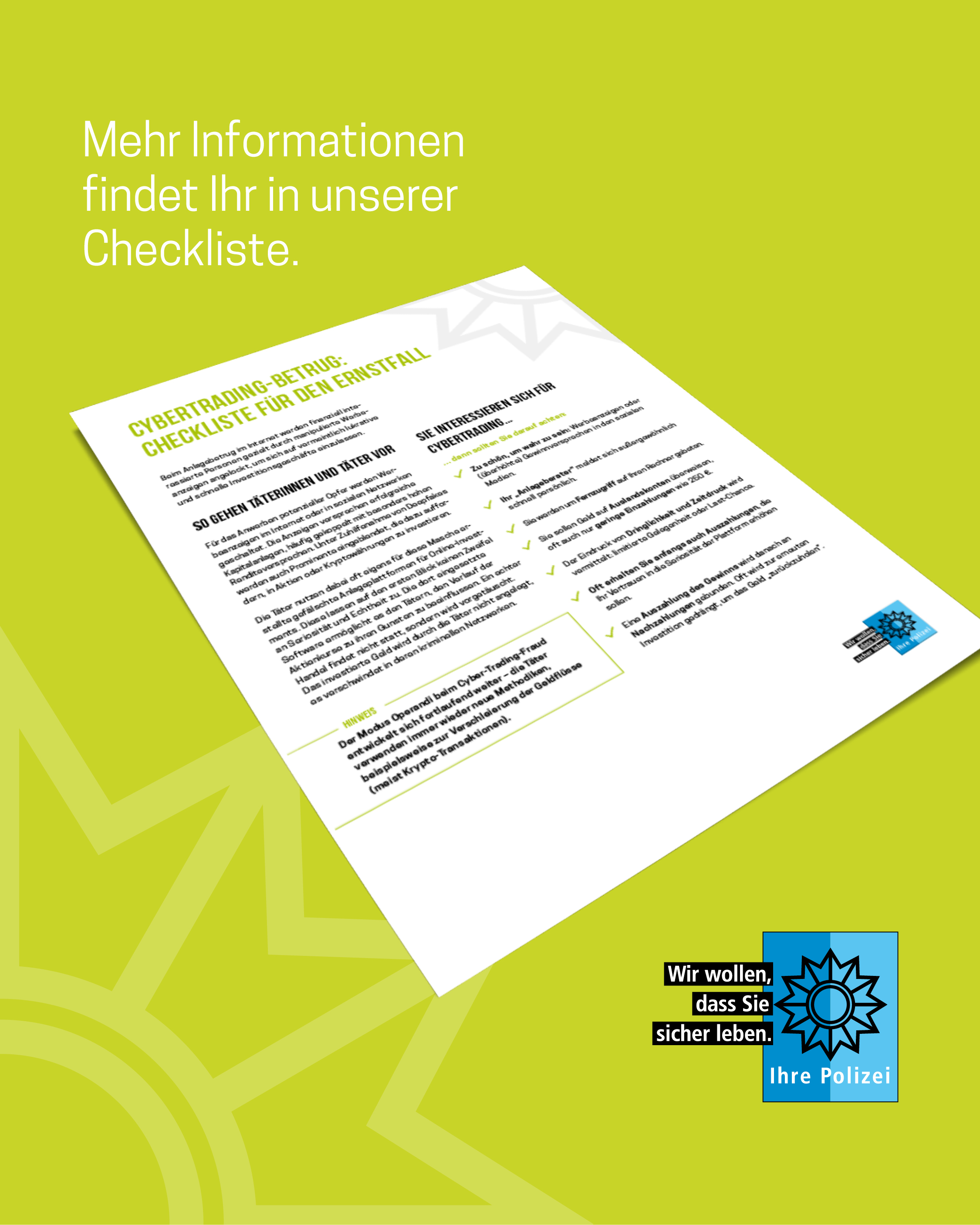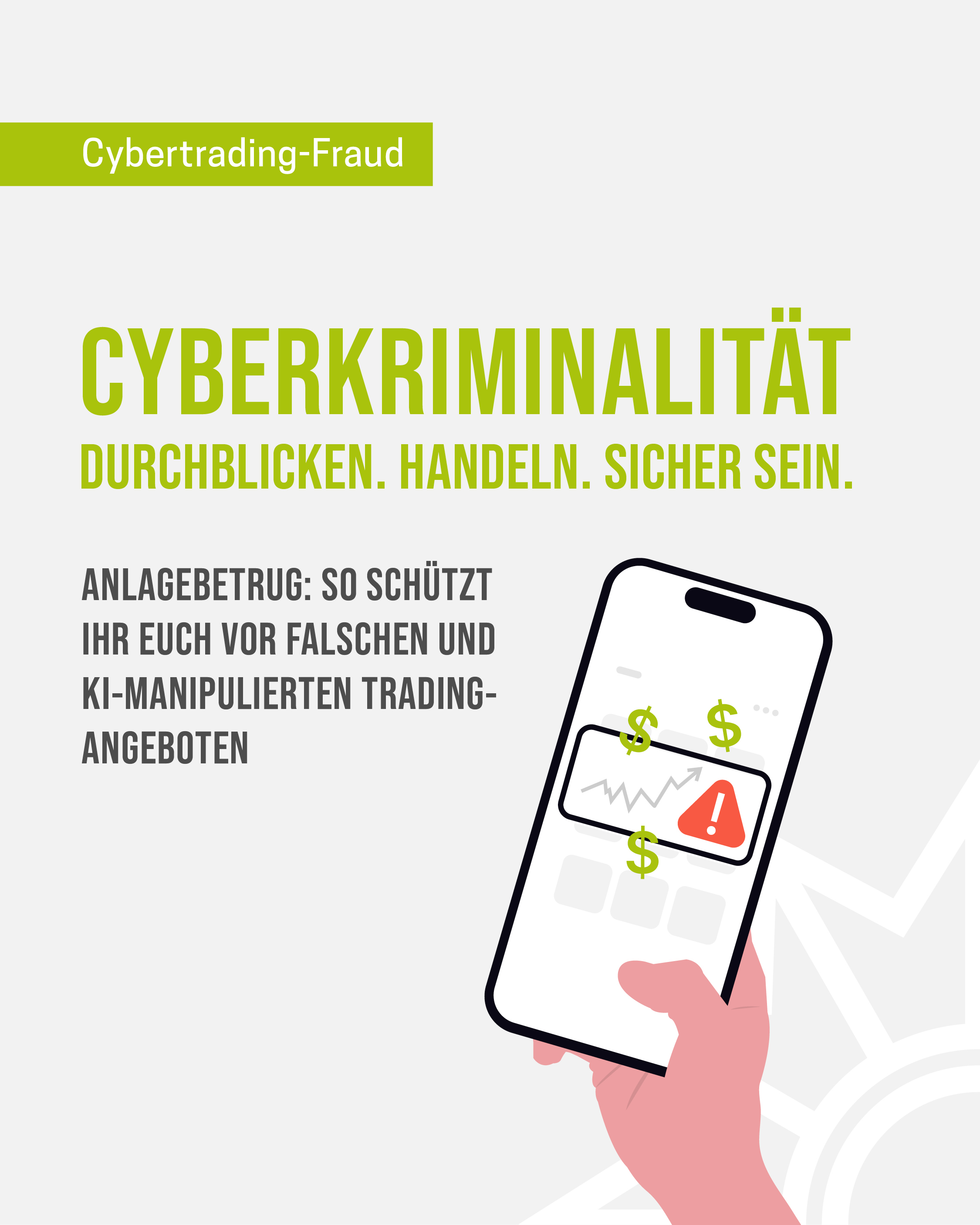 Das Medienpaket Cybertrading-Fraud Checkliste ist eine thematische Zusammenstellung aus Bild- und/ oder Textpostings für die Social Media Kanäle Facebook, Instagram und X. Wir stellen Ihnen die Beiträge zur freien Verfügung bereit. Nutzen Sie diese selbst oder leiten Sie die Postings an Ihre zuständige Social Media Stelle weiter. Wie und ob Sie die Beiträge veröffentlichen, können Sie individuell entscheiden. Texte und Hashtags können Sie frei nutzen und für Ihre Anforderungen anpassen.