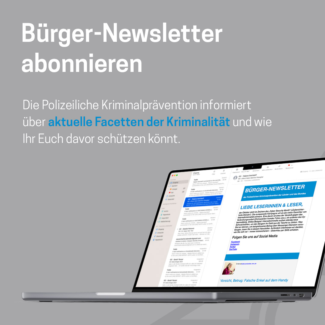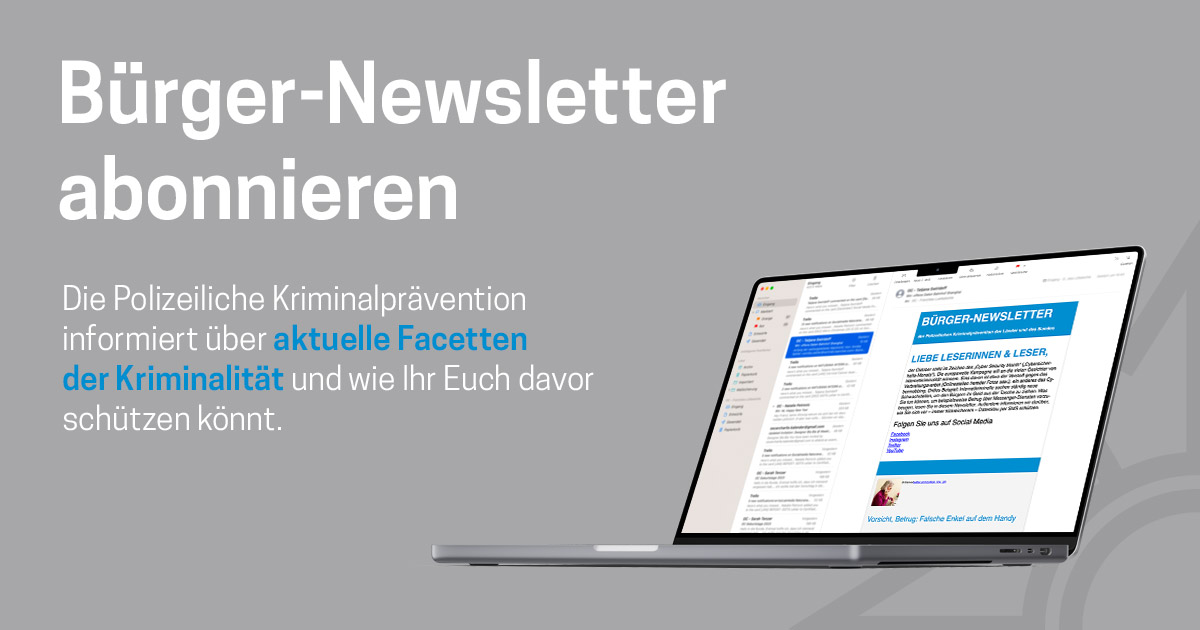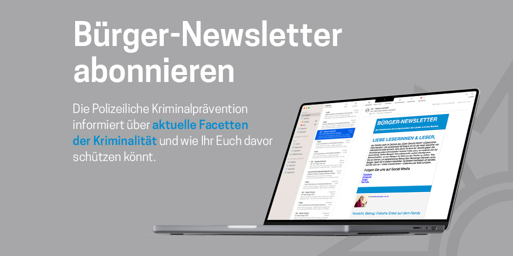 Themen : Politisch motivierte Kriminalität , Betrug , Skimming , Sexualdelikte , Schleusung , Sachbeschädigung/Graffiti , Raub/Erpressung , Qualitätssicherung , Opferschutz , Sonstiger Betrug , Sonstiger Diebstahl , Zahlungskartenbetrug , Waren-/Warenkreditbetrug , Vorauszahlungsbetrug , Verkehrsunfallprävention , Trickdiebstahl , Taschendiebstahl , Sucht/Drogen , Städtebauliche Kriminalprävention , Öffentlichkeitsarbeit , Mobbing/Stalking , Falschgeld , Fahrraddiebstahl , Sonstiges , Explosivstoffe , Enkeltrick , Einbruch , Diebstahl , Computer-/Internetkriminalität , Gewalt , Gewinnversprechen , Ladendiebstahl , Kreditvermittlungsbetrug , Kraftfahrzeugdiebstahl , Körperverletzung , Kindesmisshandlung , Jugendschutz , Integration , Haustürgeschäfte , Zivilcourage