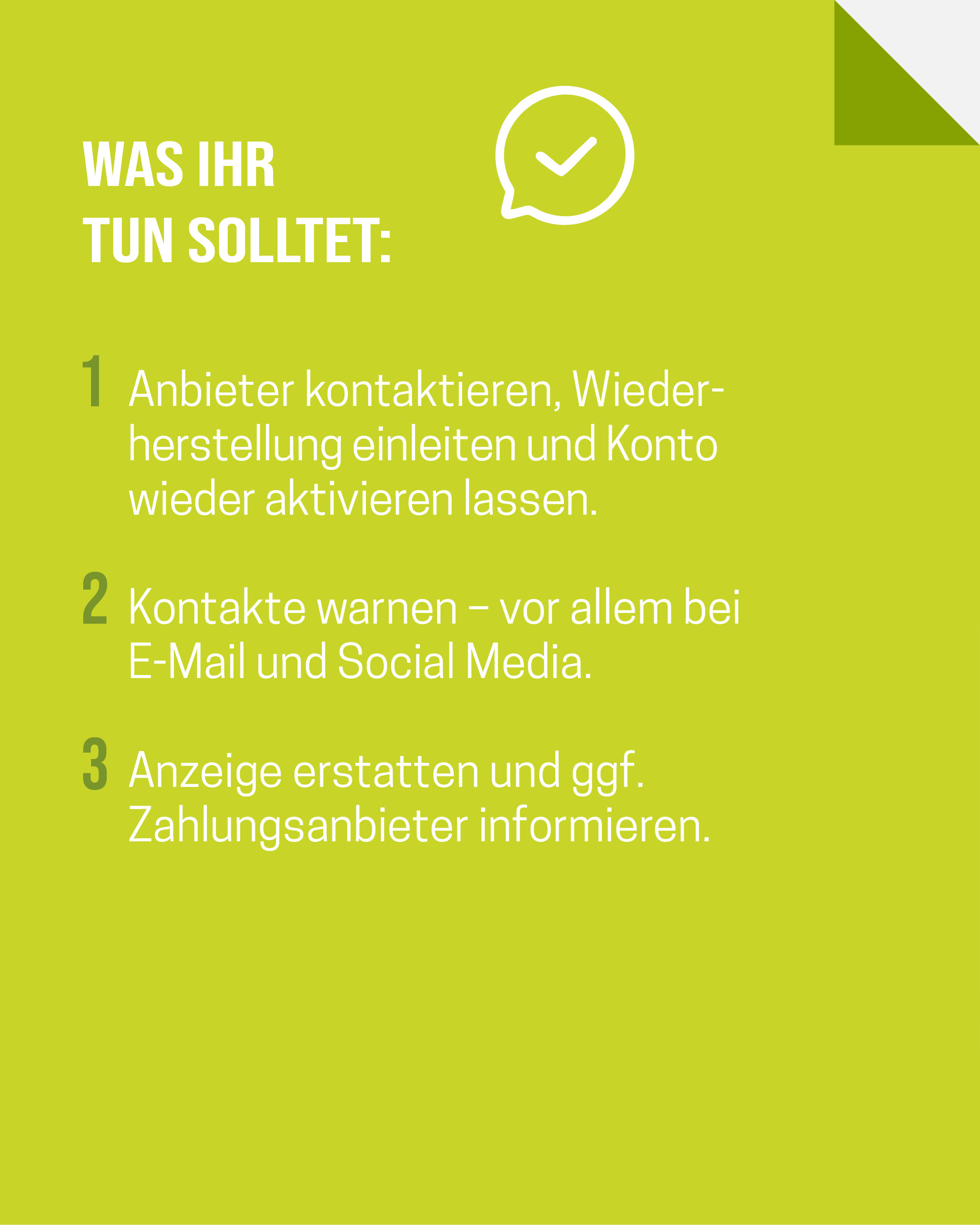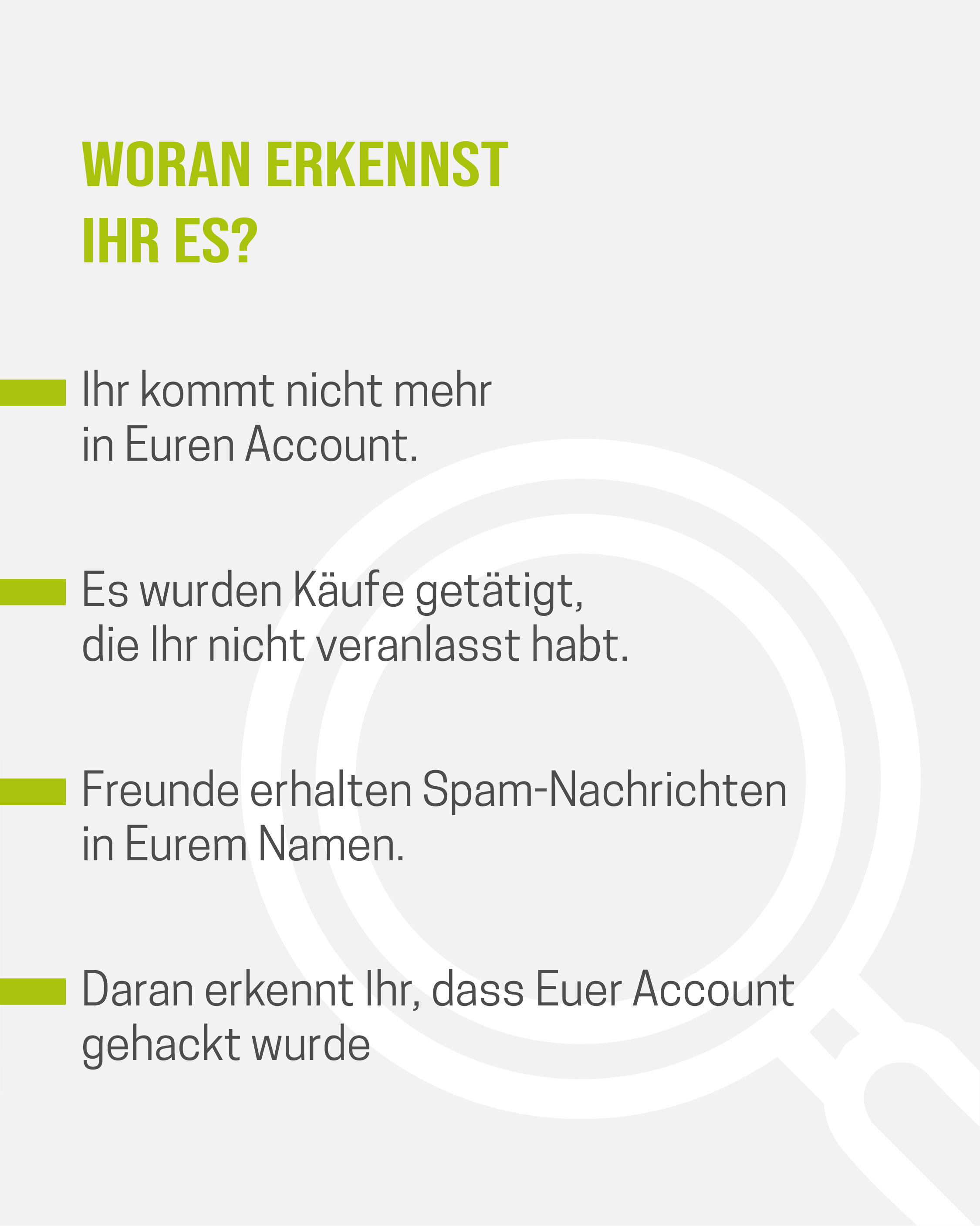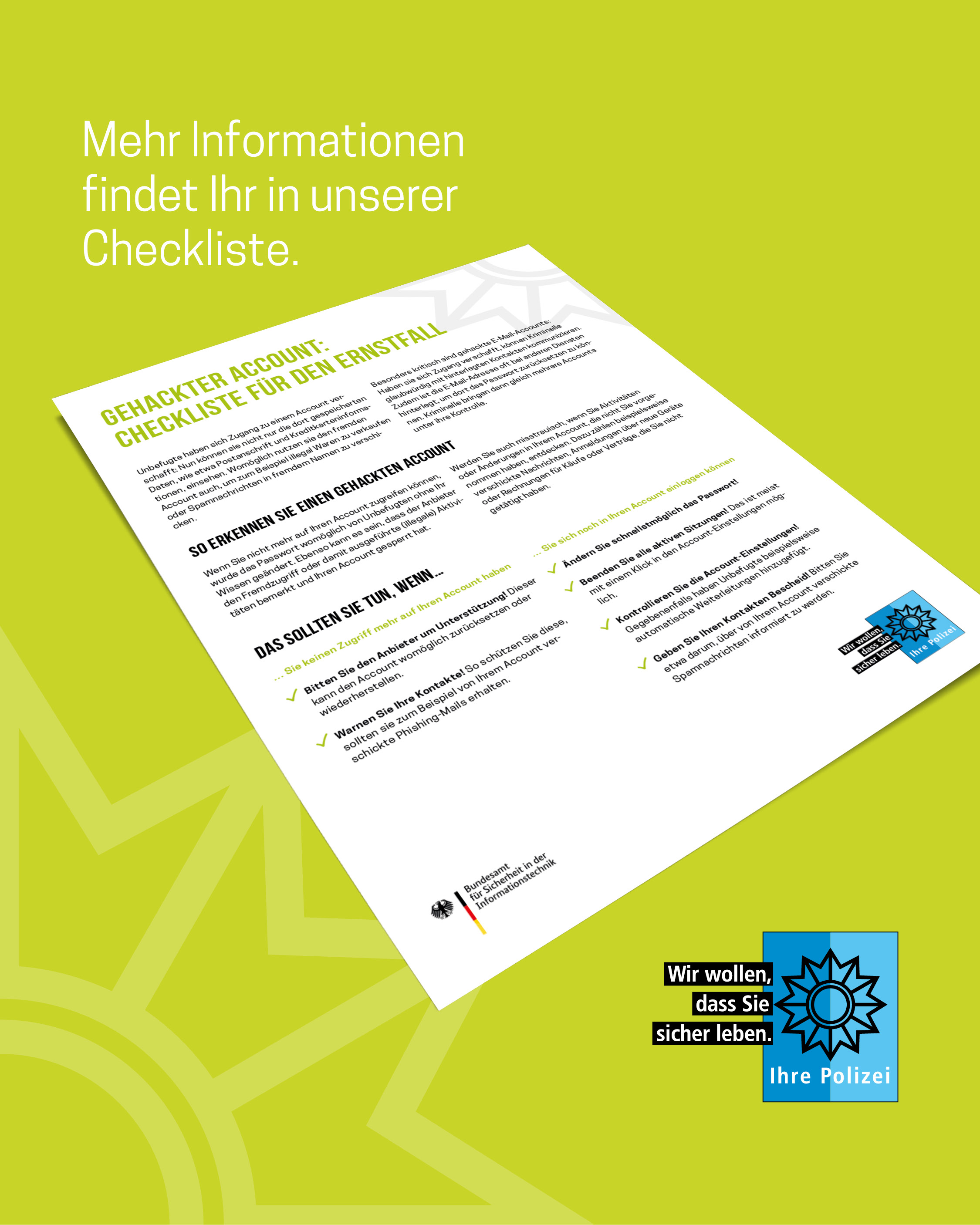 Das Medienpaket „Euer Account wurde gehackt - und jetzt?“ ist eine thematische Zusammenstellung aus Bild- und/ oder Textpostings für die Social Media Kanäle Facebook, Instagram und X. Wir stellen Ihnen die Beiträge zur freien Verfügung bereit. Nutzen Sie diese selbst oder leiten Sie die Postings an Ihre zuständige Social Media Stelle weiter. Wie und ob Sie die Beiträge veröffentlichen, können Sie individuell entscheiden. Texte und Hashtags können Sie frei nutzen und für Ihre Anforderungen anpassen.