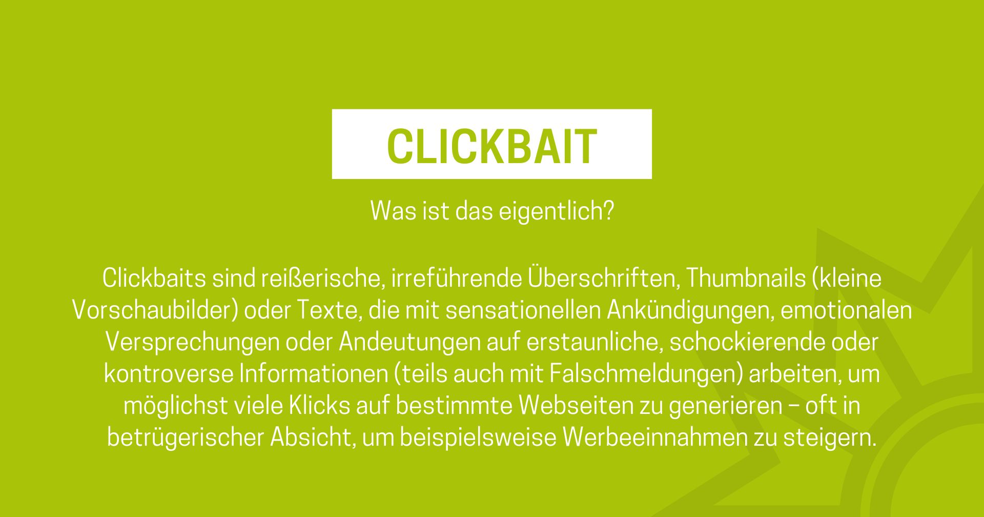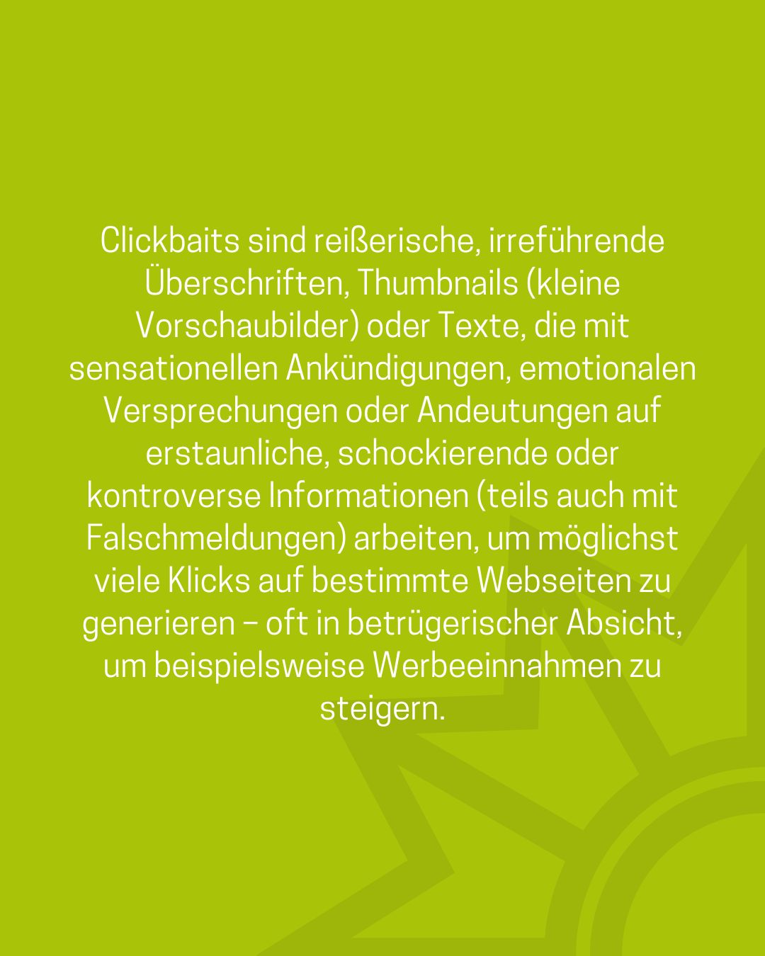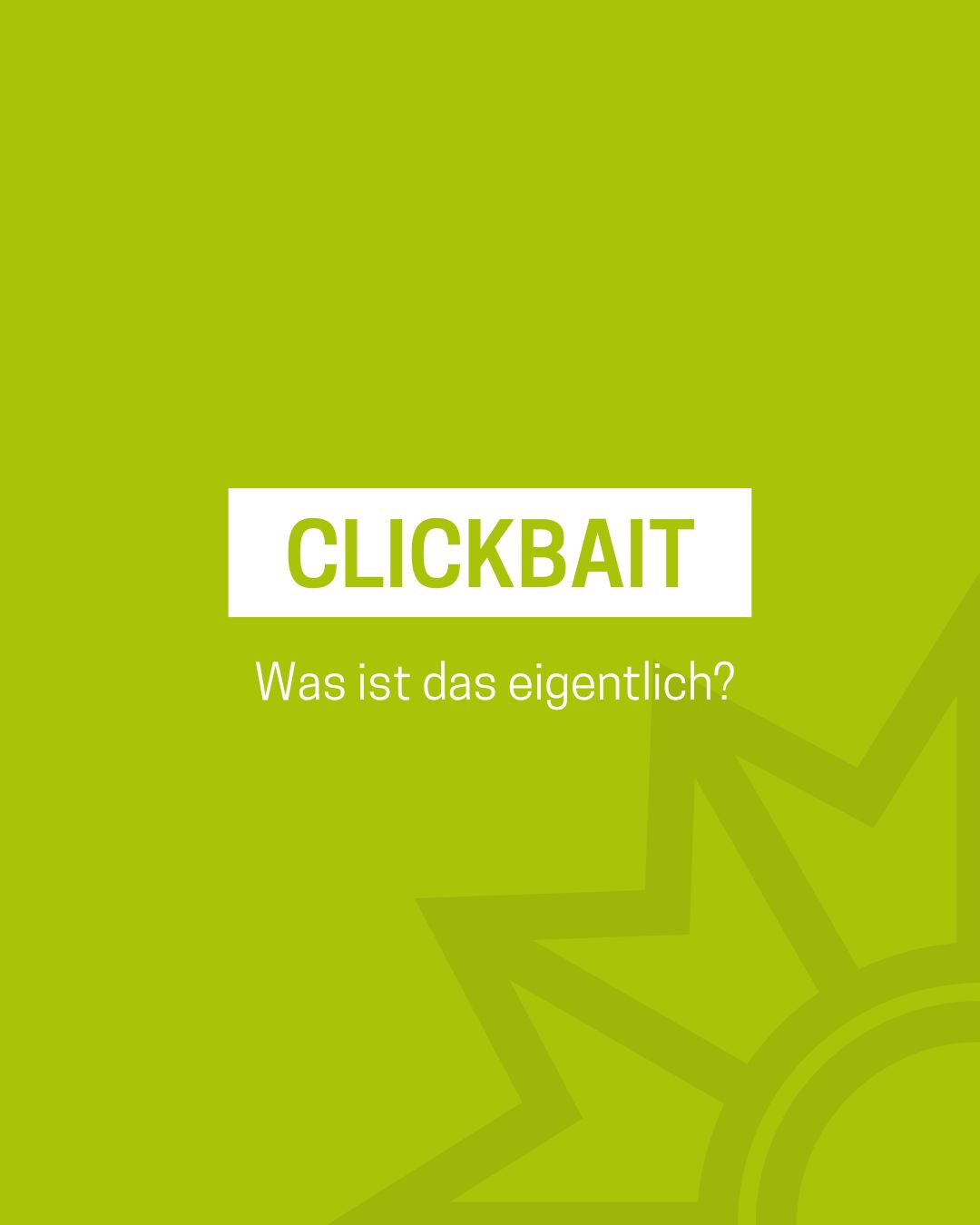 Das Medienpaket „Clickbait: Was ist das eigentlich?“ ist eine thematische Zusammenstellung aus Bild- und/ oder Textpostings für die Social Media Kanäle Facebook, Instagram und X. Wir stellen Ihnen die Beiträge zur freien Verfügung bereit. Nutzen Sie diese selbst oder leiten Sie die Postings an Ihre zuständige Social Media Stelle weiter. Wie und ob Sie die Beiträge veröffentlichen, können Sie individuell entscheiden. Texte und Hashtags können Sie frei nutzen und für Ihre Anforderungen anpassen.