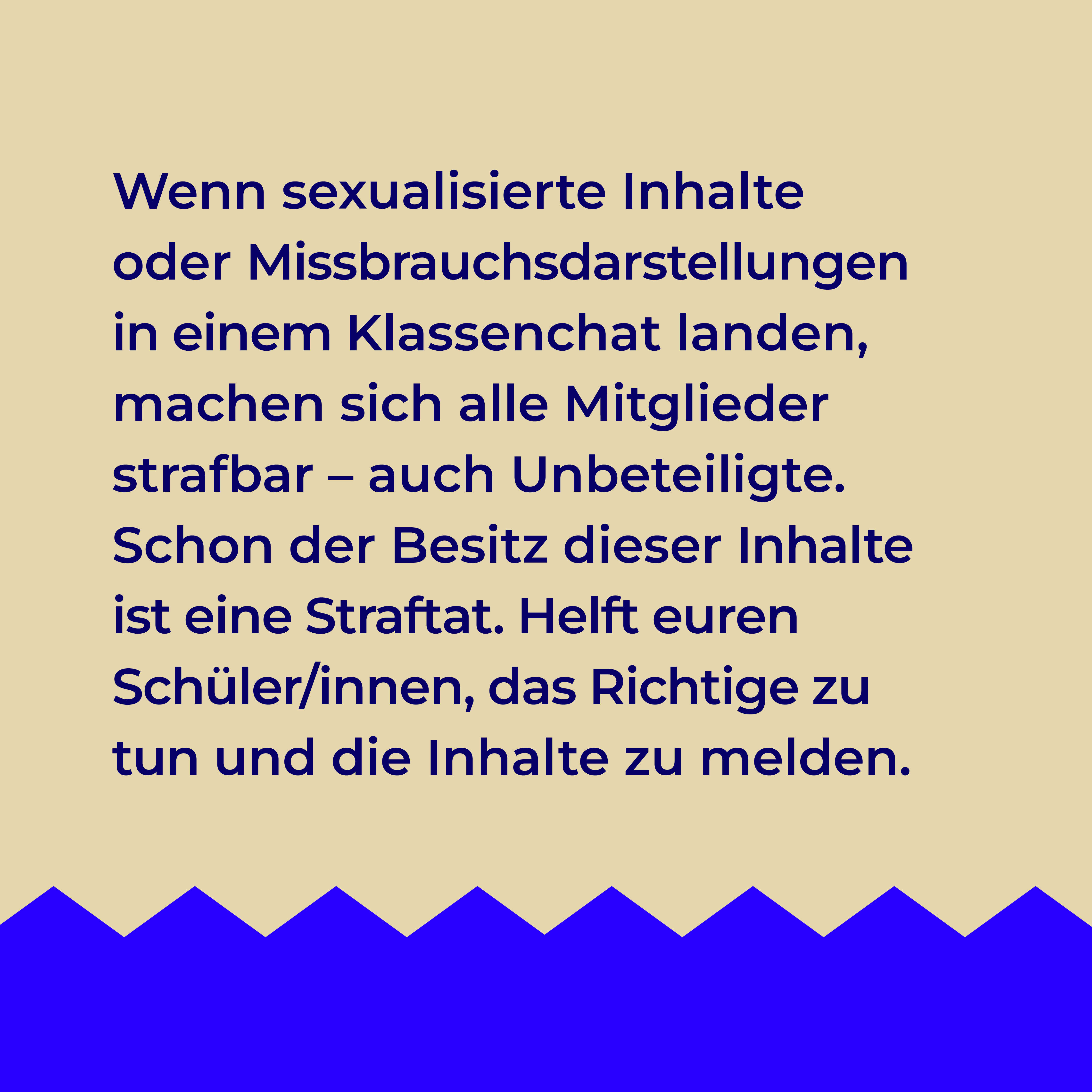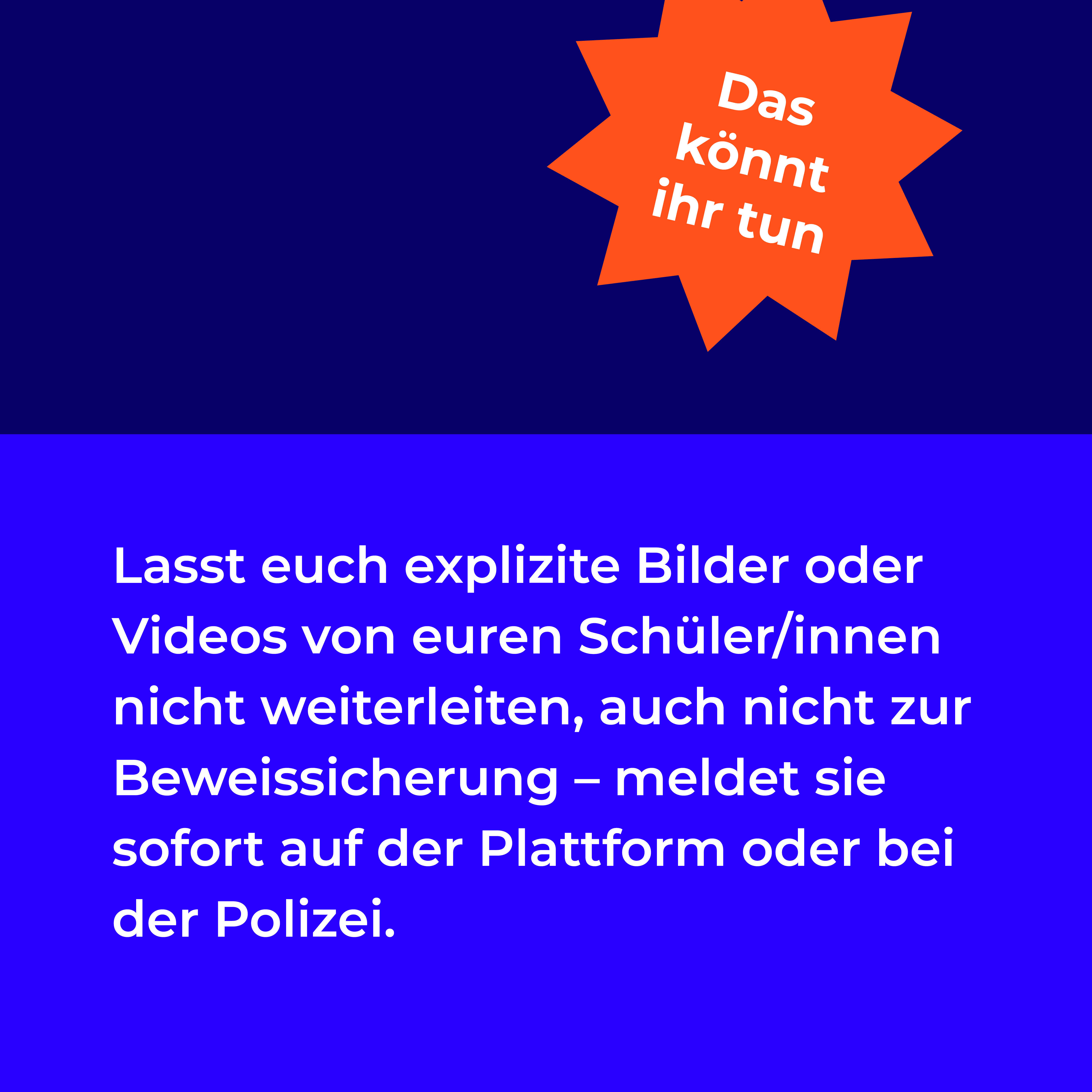 Das Medienpaket „Melden statt teilen - Tipps für Lehrer“ ist eine thematische Zusammenstellung aus Bild- und/ oder Textpostings für die Social Media Kanäle Facebook, Instagram und X. Wir stellen Ihnen die Beiträge zur freien Verfügung bereit. Nutzen Sie diese selbst oder leiten Sie die Postings an Ihre zuständige Social Media Stelle weiter. Wie und ob Sie die Beiträge veröffentlichen, können Sie individuell entscheiden. Texte und Hashtags können Sie frei nutzen und für Ihre Anforderungen anpassen.