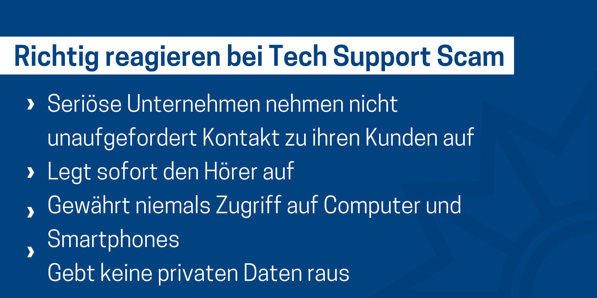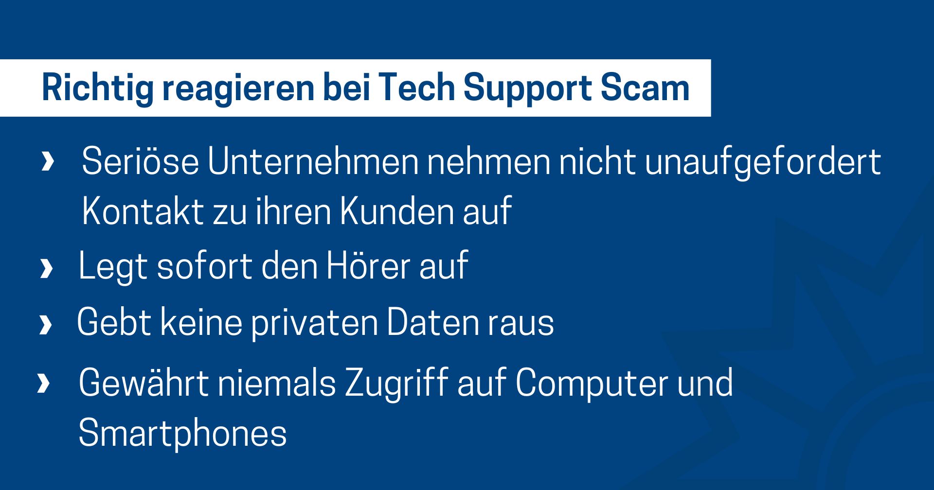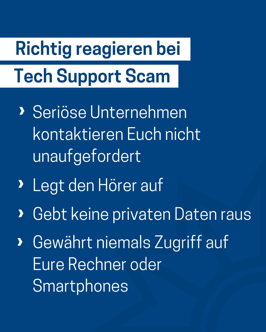 Das Medienpaket „Richtig reagieren bei Tech Support Scam“ ist eine thematische Zusammenstellung aus Bild- und/ oder Textpostings für die Social Media Kanäle Facebook, Instagram und X. Wir stellen Ihnen die Beiträge zur freien Verfügung bereit. Nutzen Sie diese selbst oder leiten Sie die Postings an Ihre zuständige Social Media Stelle weiter. Wie und ob Sie die Beiträge veröffentlichen, können Sie individuell entscheiden. Texte und Hashtags können Sie frei nutzen und für Ihre Anforderungen anpassen.