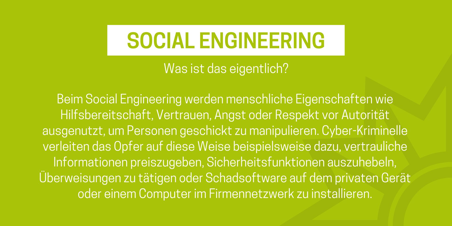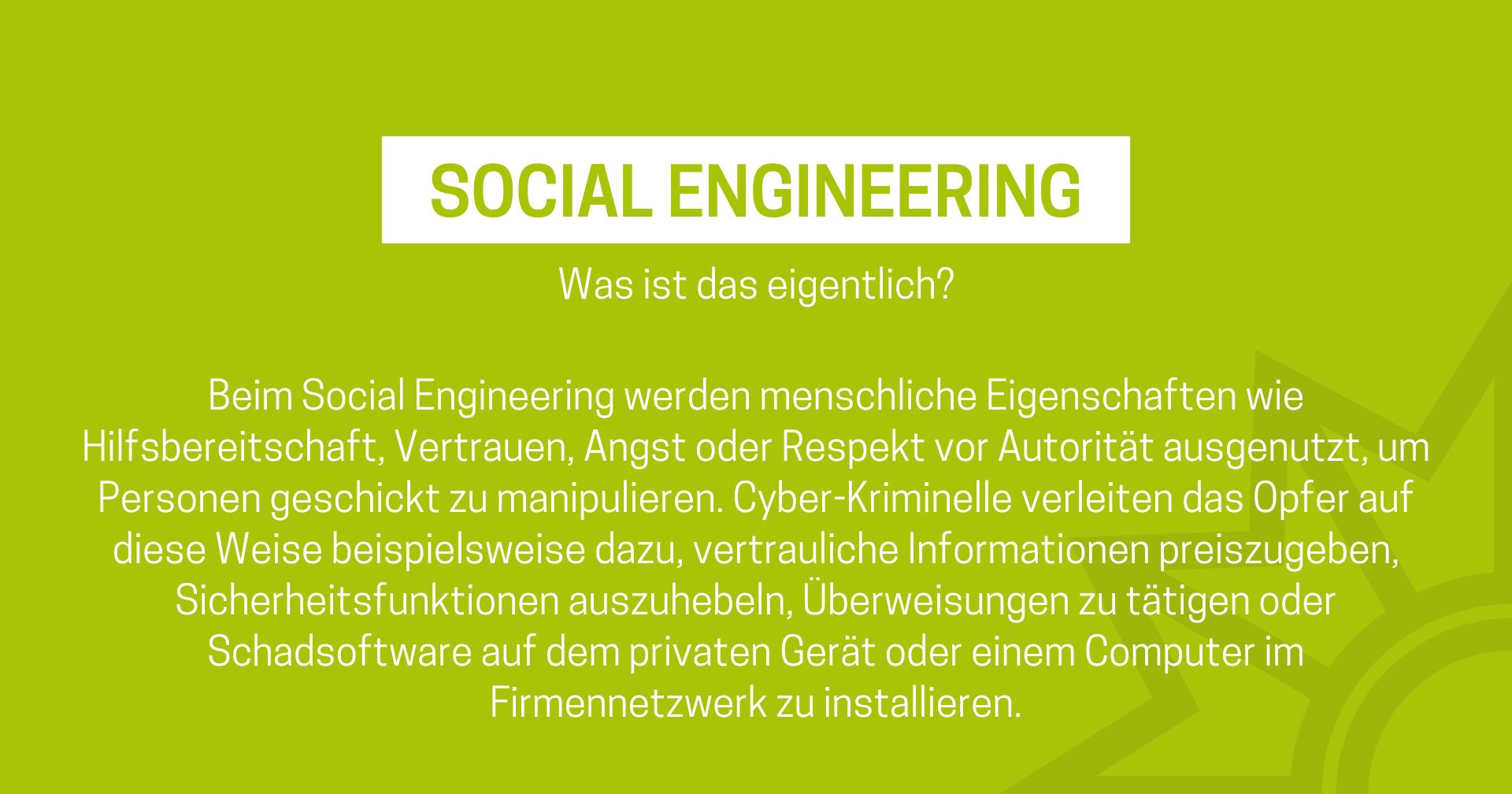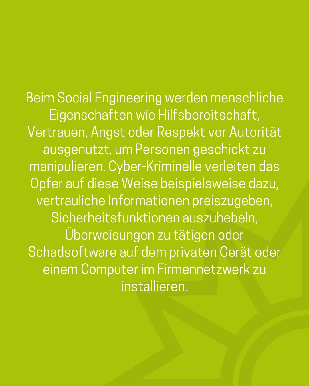 Das Medienpaket „Social Engineering: Was ist das eigentlich?“ ist eine thematische Zusammenstellung aus Bild- und/ oder Textpostings für die Social Media Kanäle Facebook, Instagram und X. Wir stellen Ihnen die Beiträge zur freien Verfügung bereit. Nutzen Sie diese selbst oder leiten Sie die Postings an Ihre zuständige Social Media Stelle weiter. Wie und ob Sie die Beiträge veröffentlichen, können Sie individuell entscheiden. Texte und Hashtags können Sie frei nutzen und für Ihre Anforderungen anpassen.