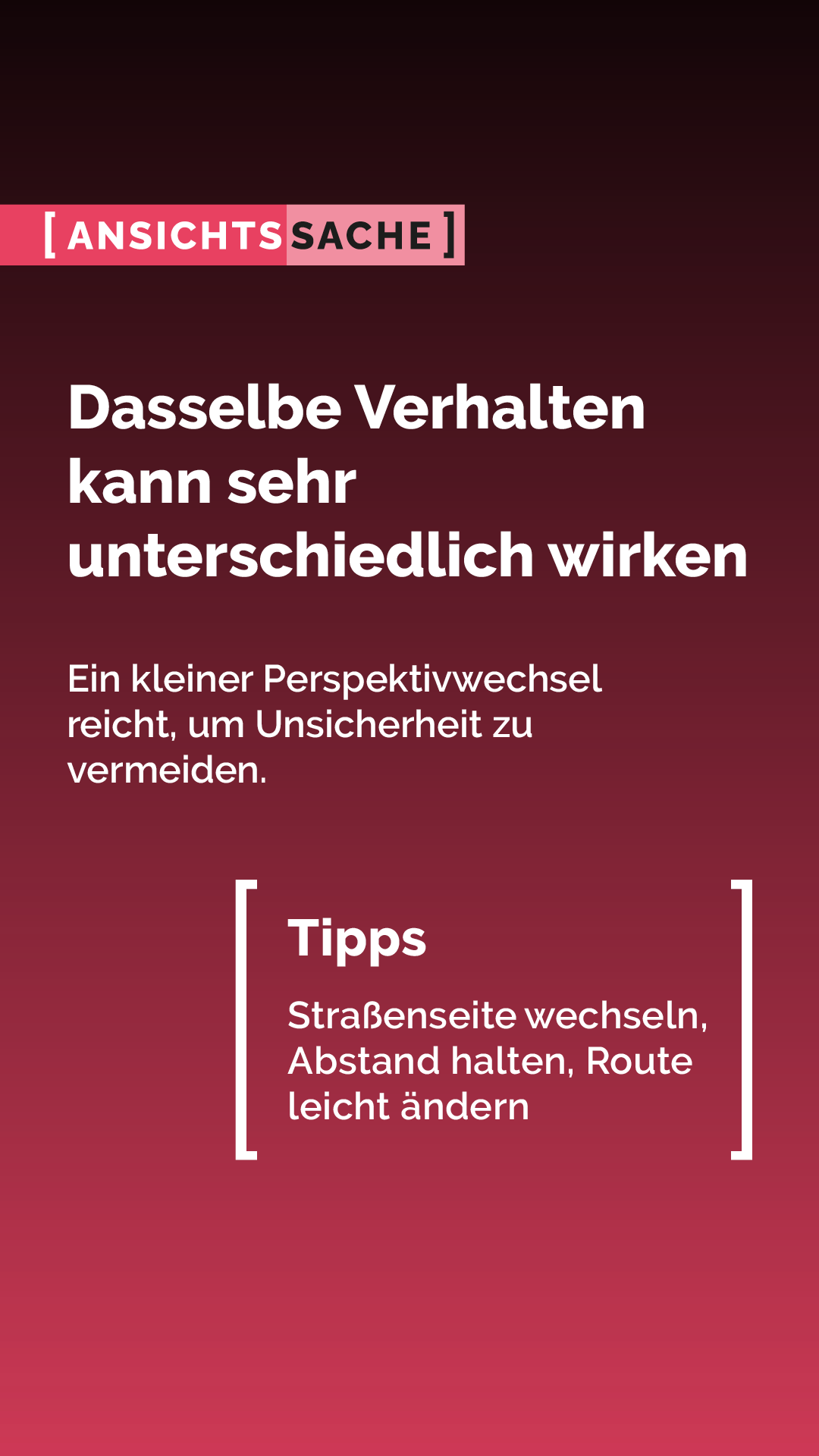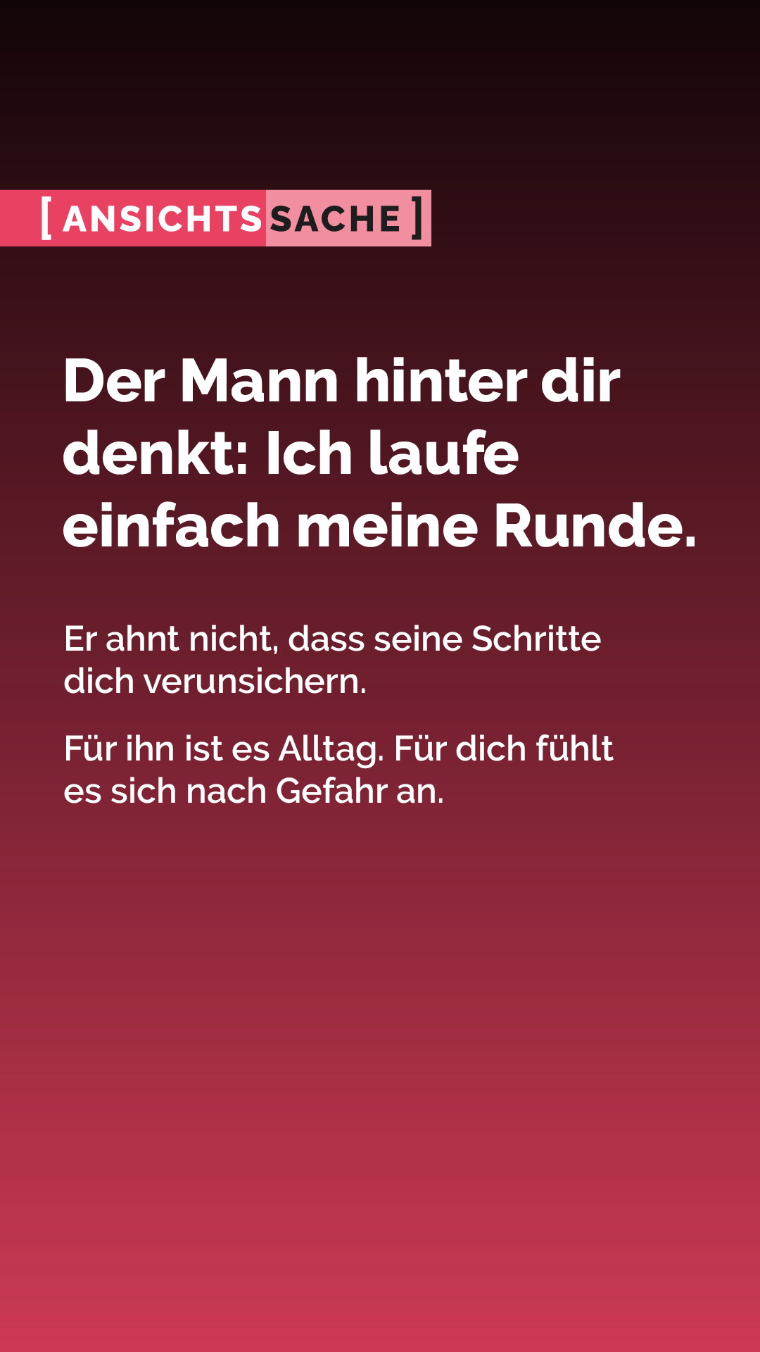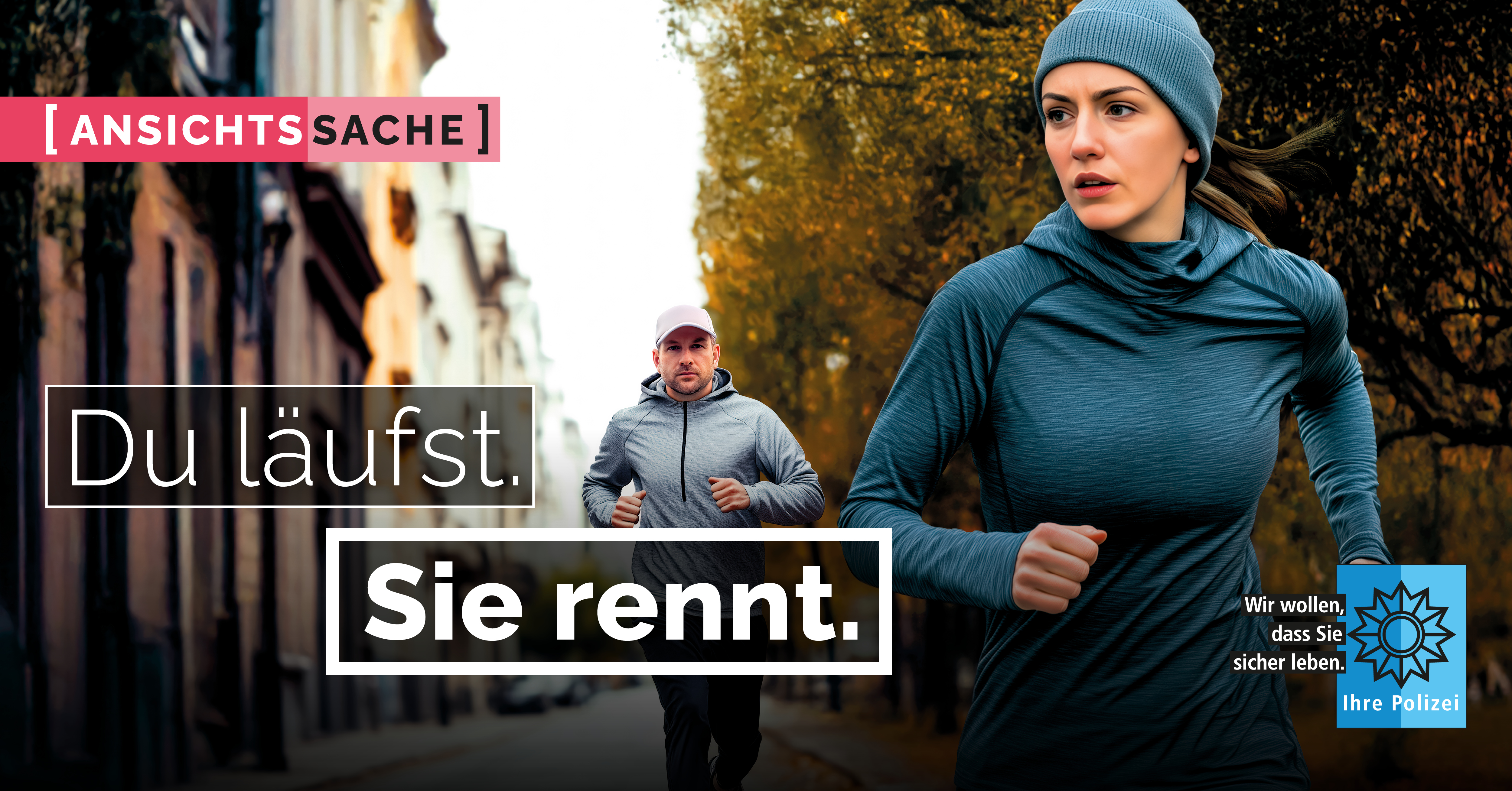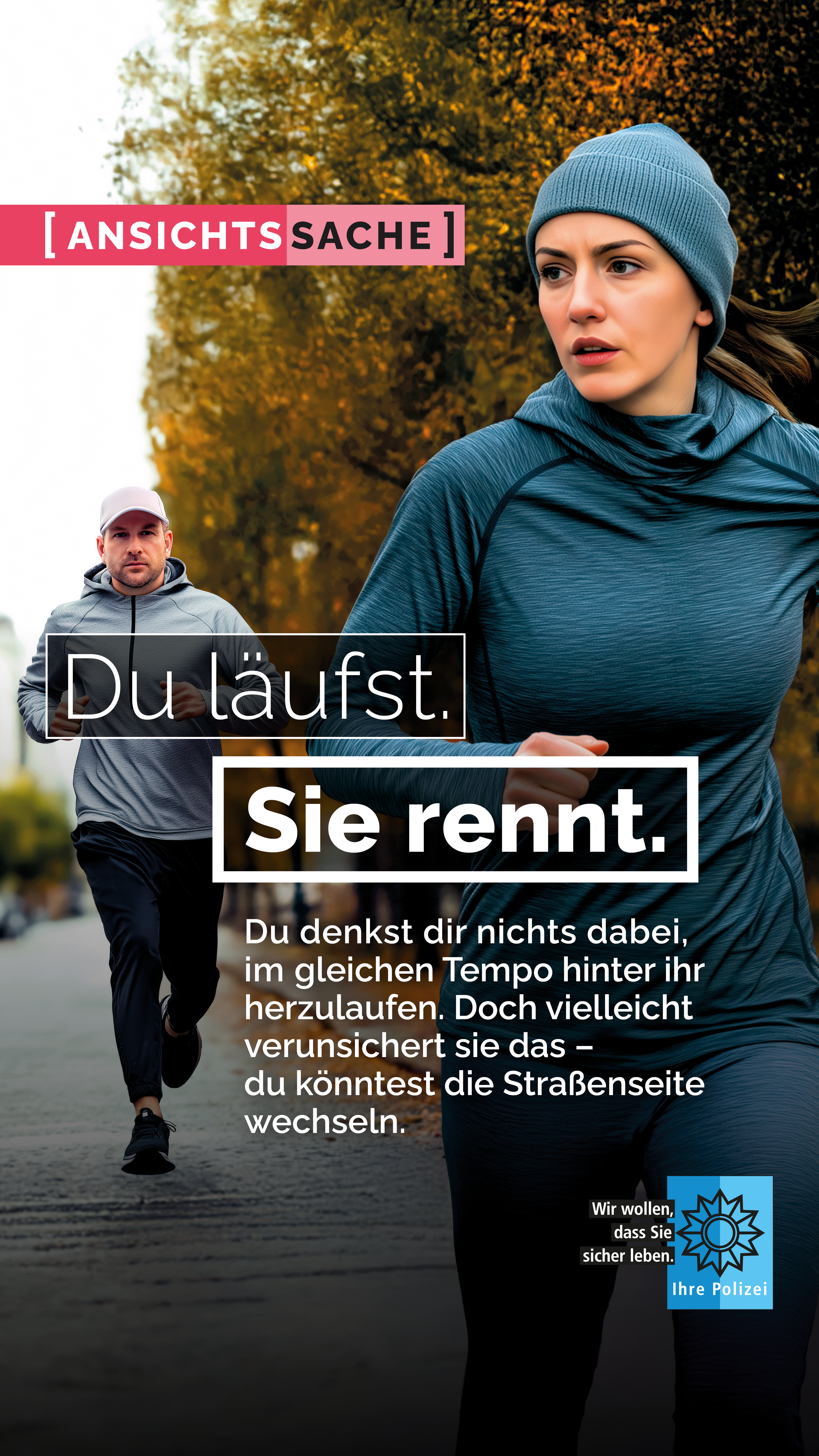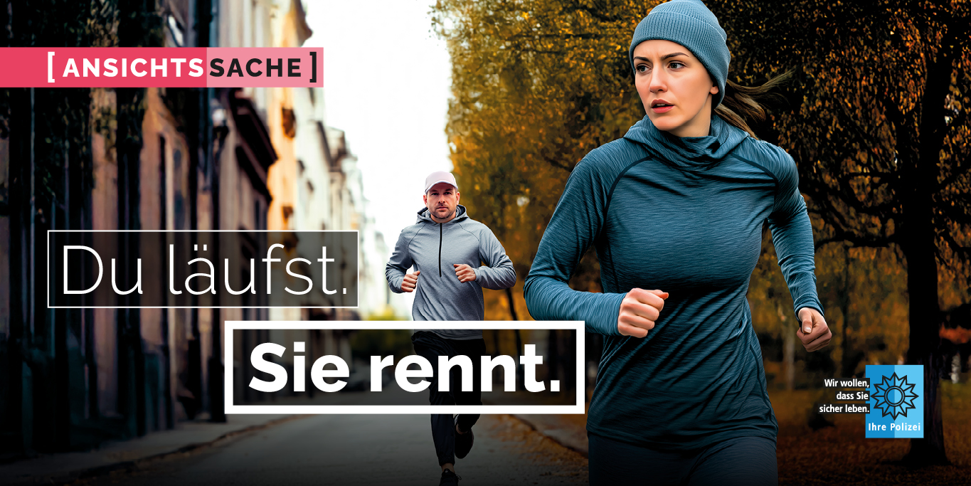 Das Medienpaket „AnsichtsSache - Du läufst. Sie rennt.“ ist eine thematische Zusammenstellung aus Bild- und/ oder Textpostings für die Social Media Kanäle Facebook, Instagram und X. Wir stellen Ihnen die Beiträge zur freien Verfügung bereit. Nutzen Sie diese selbst oder leiten Sie die Postings an Ihre zuständige Social Media Stelle weiter. Wie und ob Sie die Beiträge veröffentlichen, können Sie individuell entscheiden. Texte und Hashtags können Sie frei nutzen und für Ihre Anforderungen anpassen.