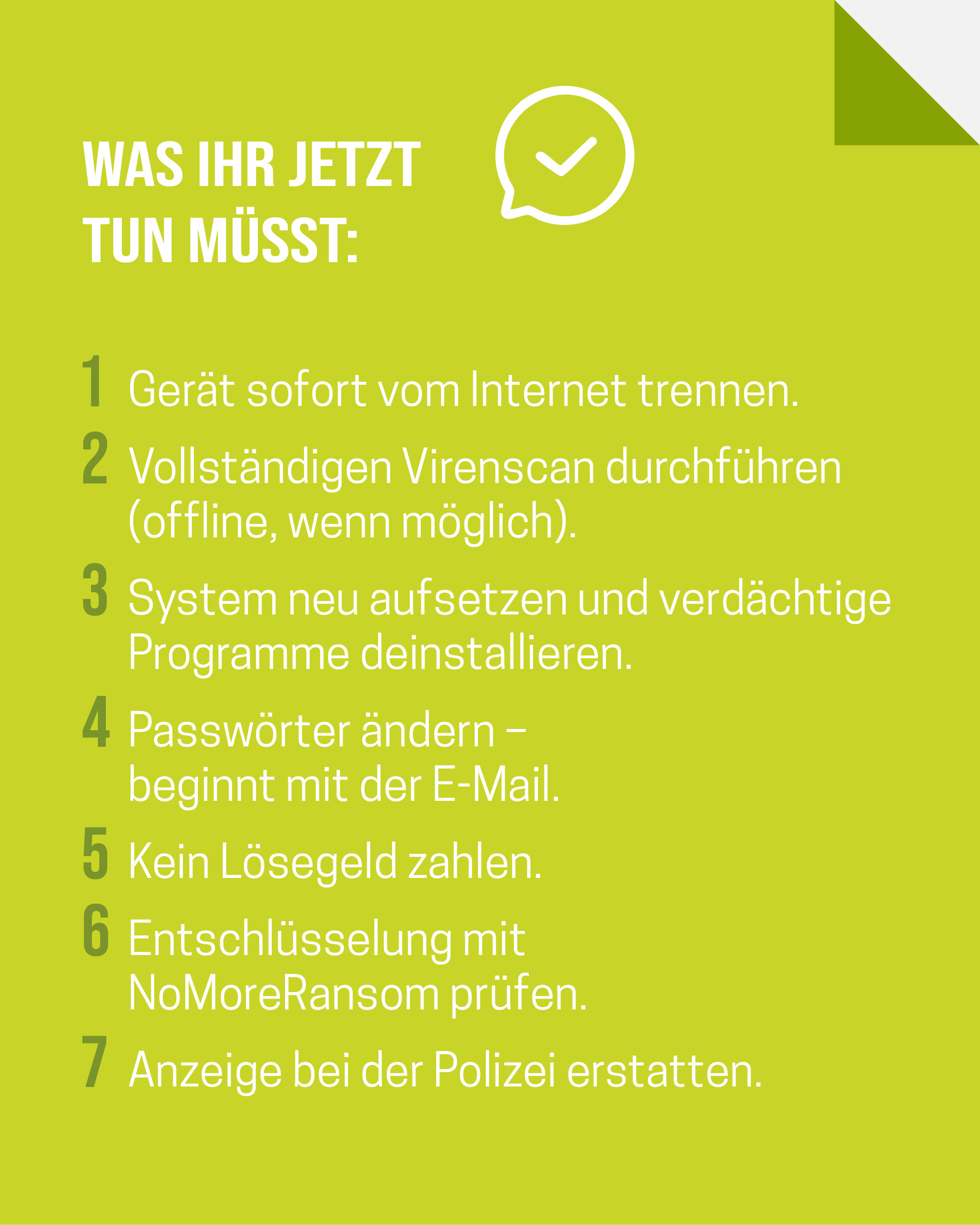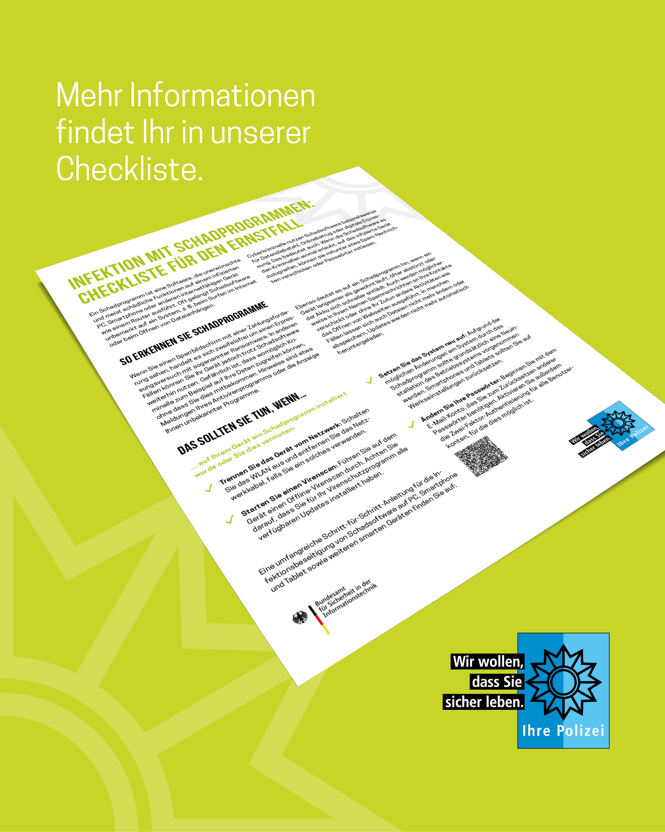 Das Medienpaket „Bewerbung Checkliste zum Schutz vor Schadsoftware“ ist eine thematische Zusammenstellung aus Bild- und/ oder Textpostings für die Social Media Kanäle Facebook, Instagram und X. Wir stellen Ihnen die Beiträge zur freien Verfügung bereit. Nutzen Sie diese selbst oder leiten Sie die Postings an Ihre zuständige Social Media Stelle weiter. Wie und ob Sie die Beiträge veröffentlichen, können Sie individuell entscheiden. Texte und Hashtags können Sie frei nutzen und für Ihre Anforderungen anpassen.