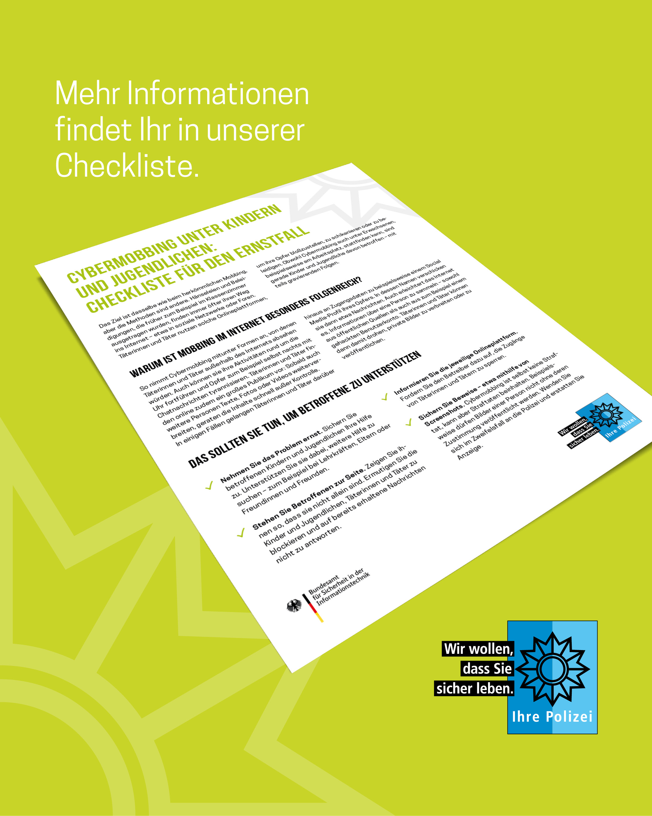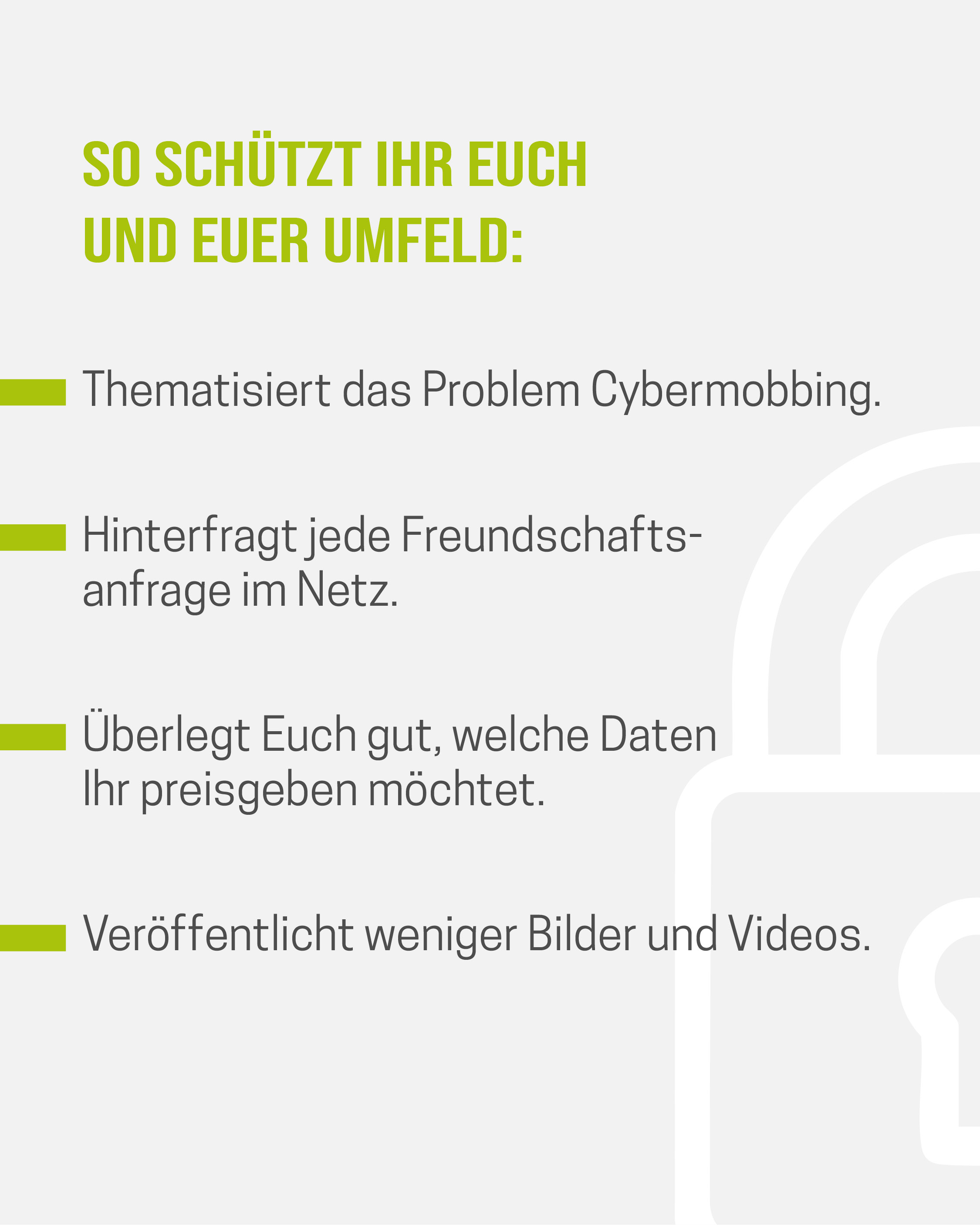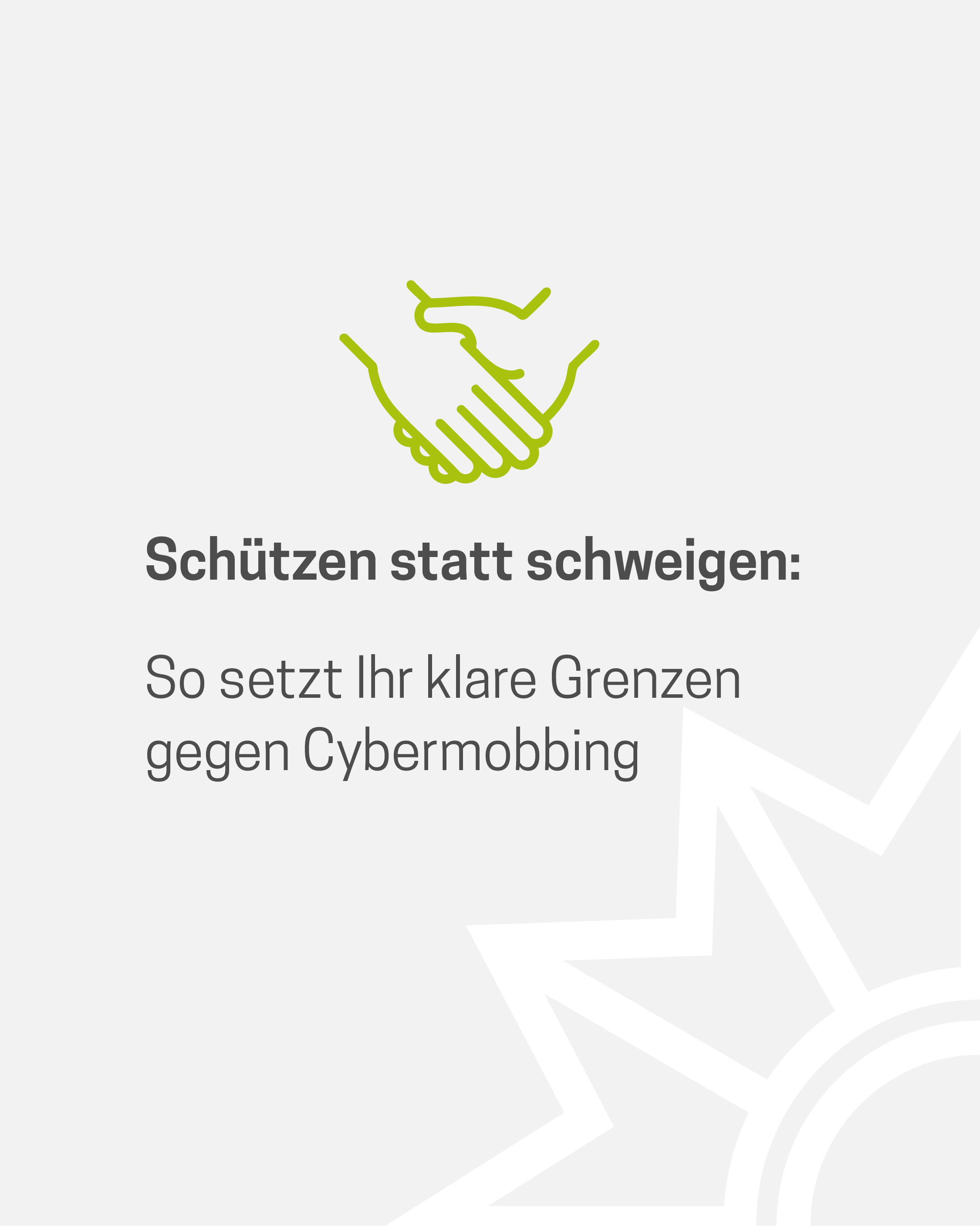 Das Medienpaket „Cybermobbing: Wenn digitale Worte verletzen“ ist eine thematische Zusammenstellung aus Bild- und/ oder Textpostings für die Social Media Kanäle Facebook, Instagram und X. Wir stellen Ihnen die Beiträge zur freien Verfügung bereit. Nutzen Sie diese selbst oder leiten Sie die Postings an Ihre zuständige Social Media Stelle weiter. Wie und ob Sie die Beiträge veröffentlichen, können Sie individuell entscheiden. Texte und Hashtags können Sie frei nutzen und für Ihre Anforderungen anpassen.