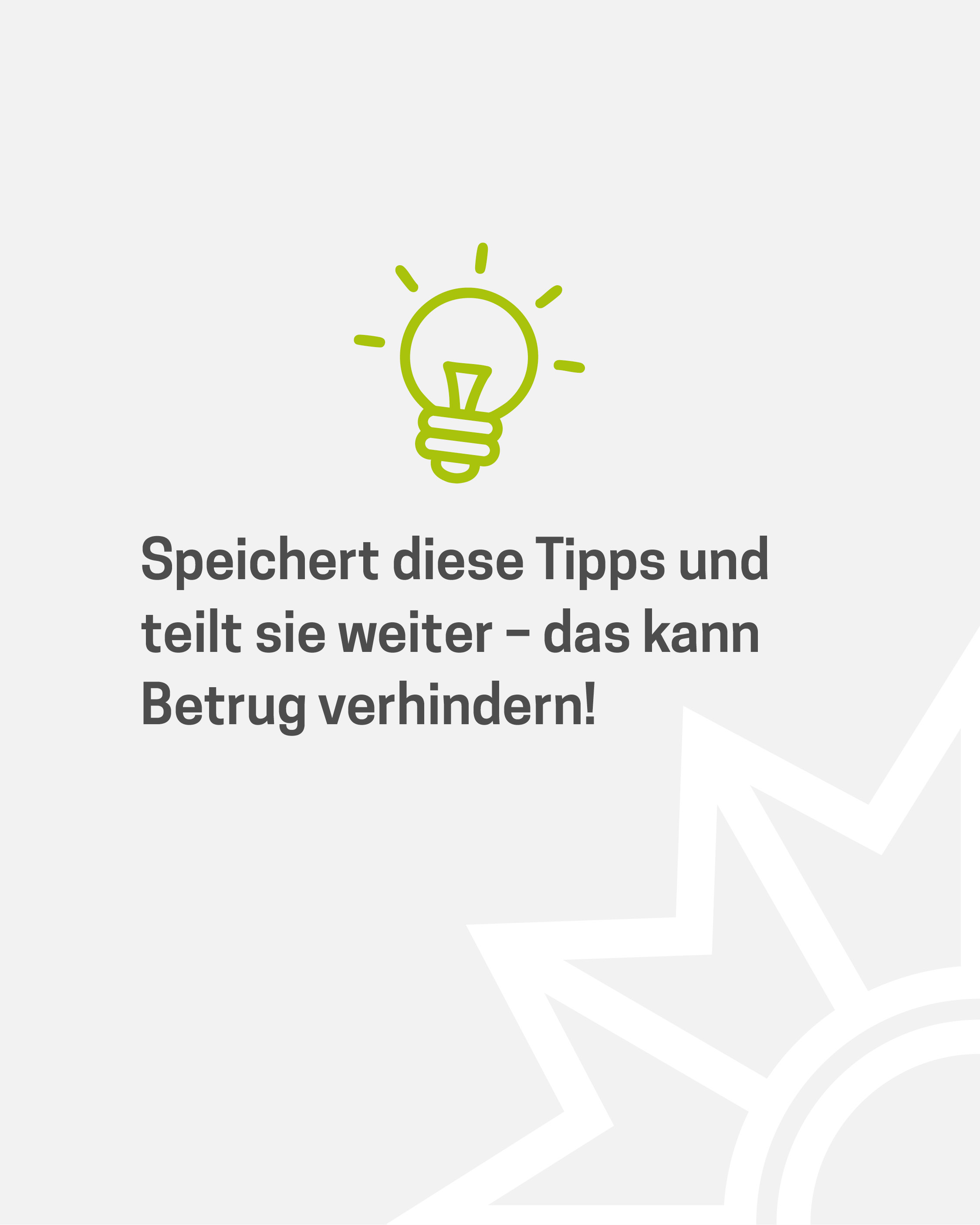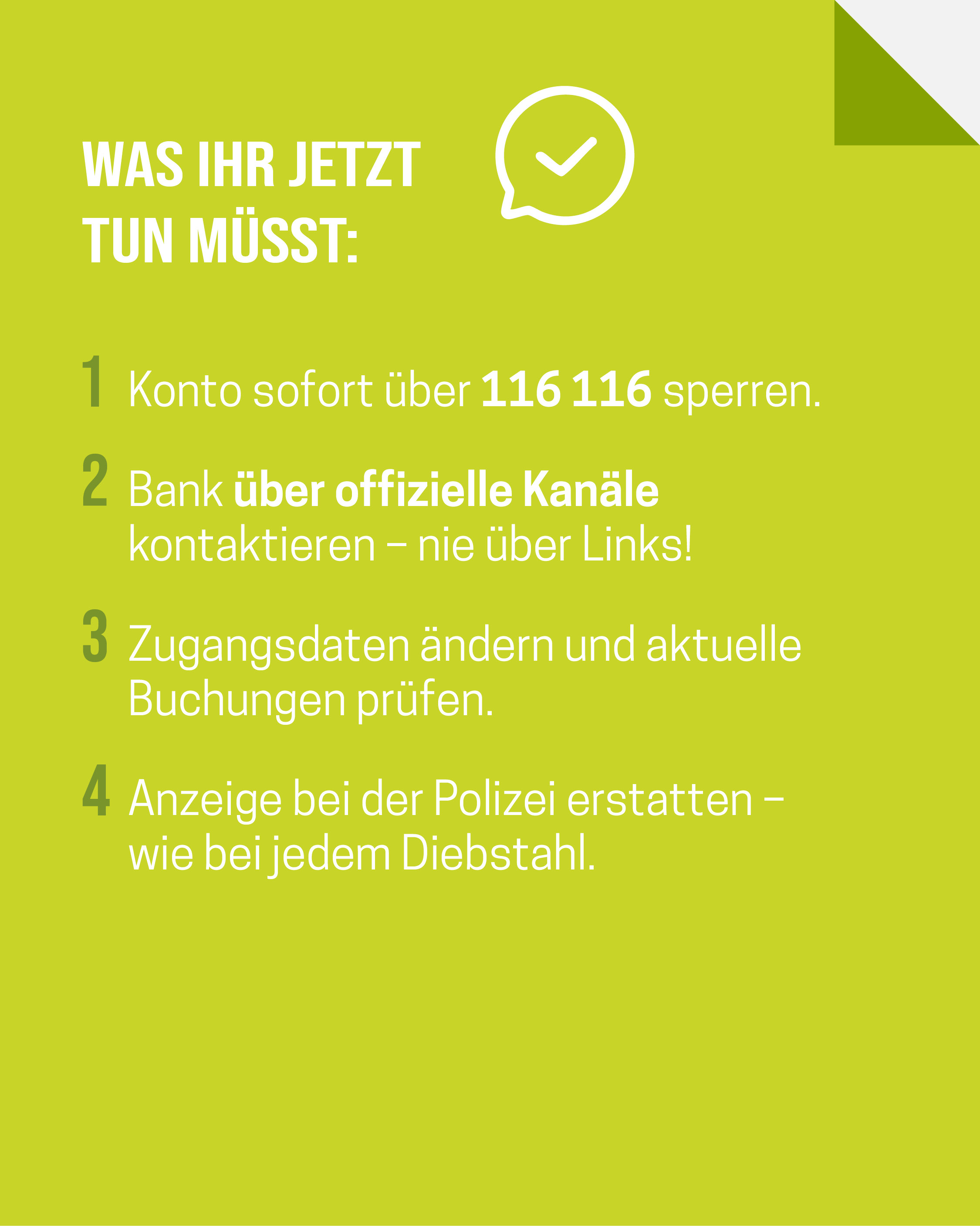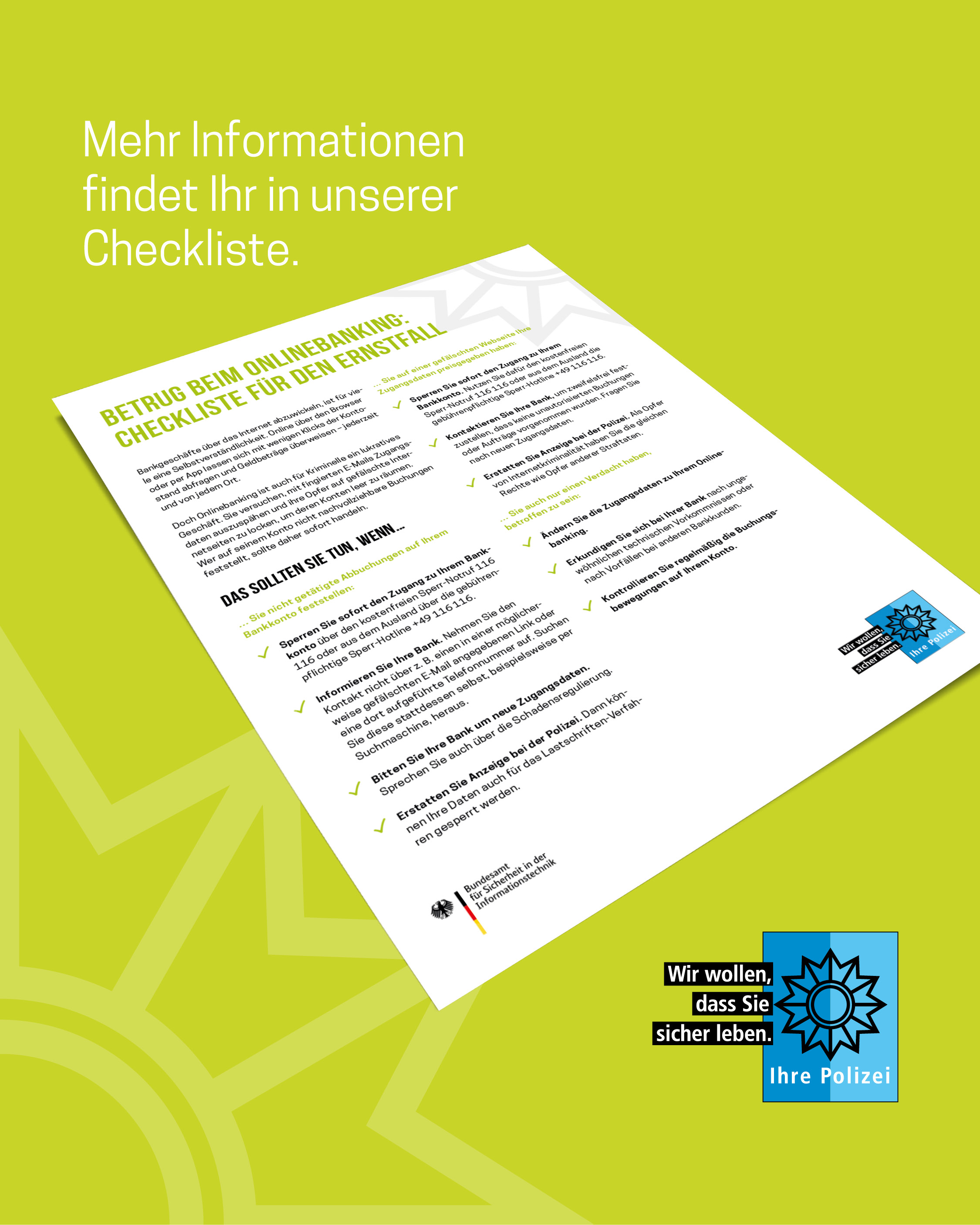 Das Medienpaket „Onlinebanking-Betrug: Durchblicken. Handeln. Sicher sein.“ ist eine thematische Zusammenstellung aus Bild- und/ oder Textpostings für die Social Media Kanäle Facebook, Instagram und X. Wir stellen Ihnen die Beiträge zur freien Verfügung bereit. Nutzen Sie diese selbst oder leiten Sie die Postings an Ihre zuständige Social Media Stelle weiter. Wie und ob Sie die Beiträge veröffentlichen, können Sie individuell entscheiden. Texte und Hashtags können Sie frei nutzen und für Ihre Anforderungen anpassen.