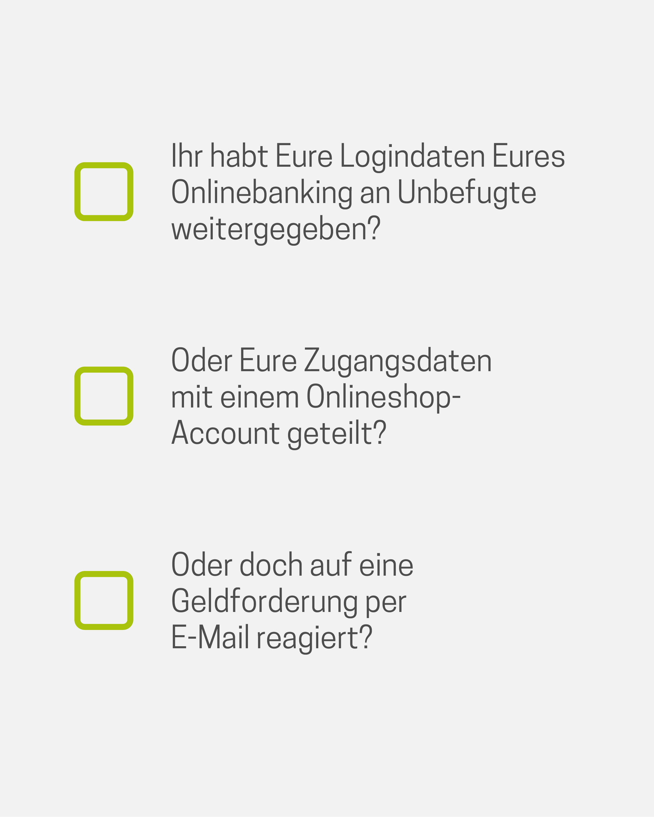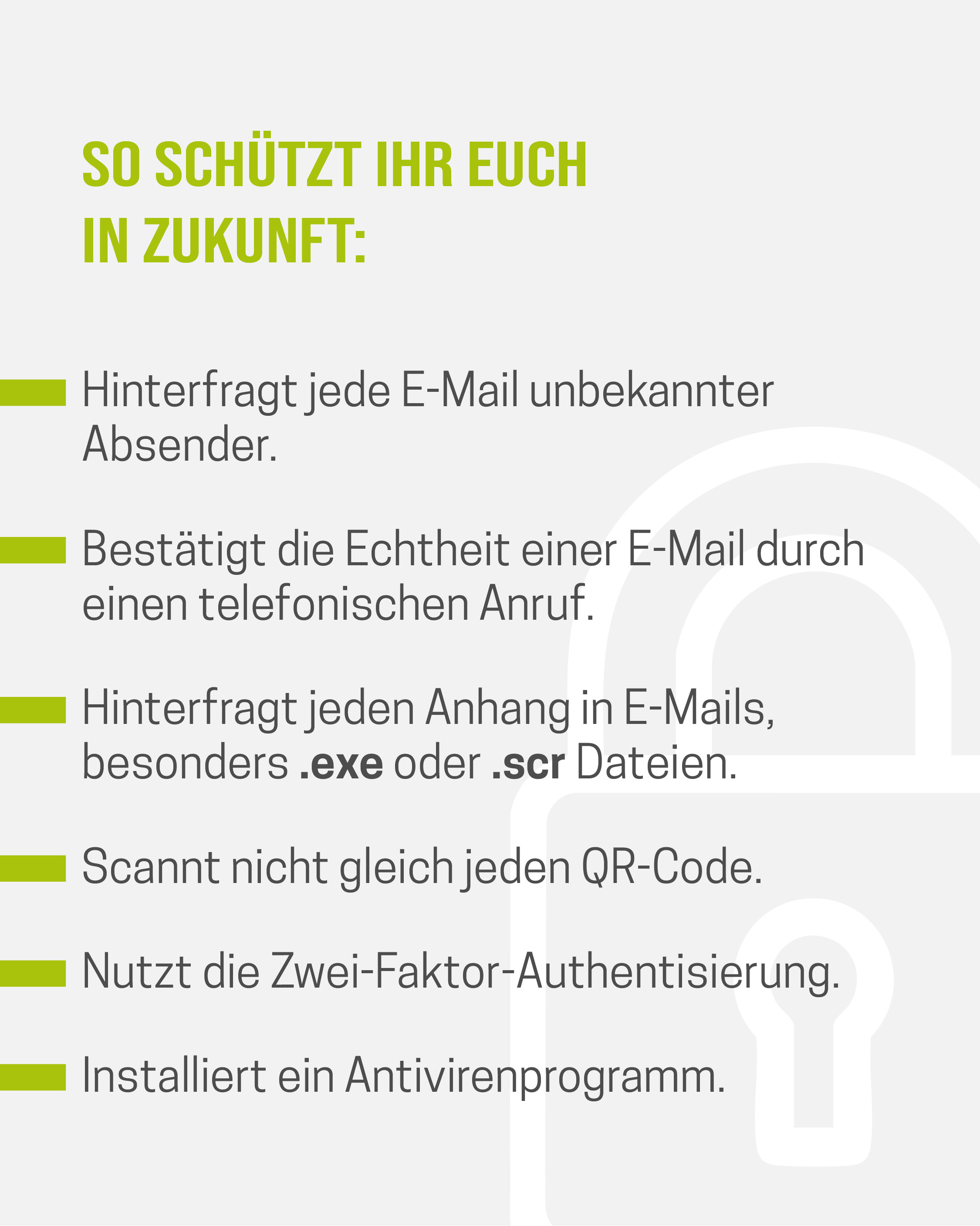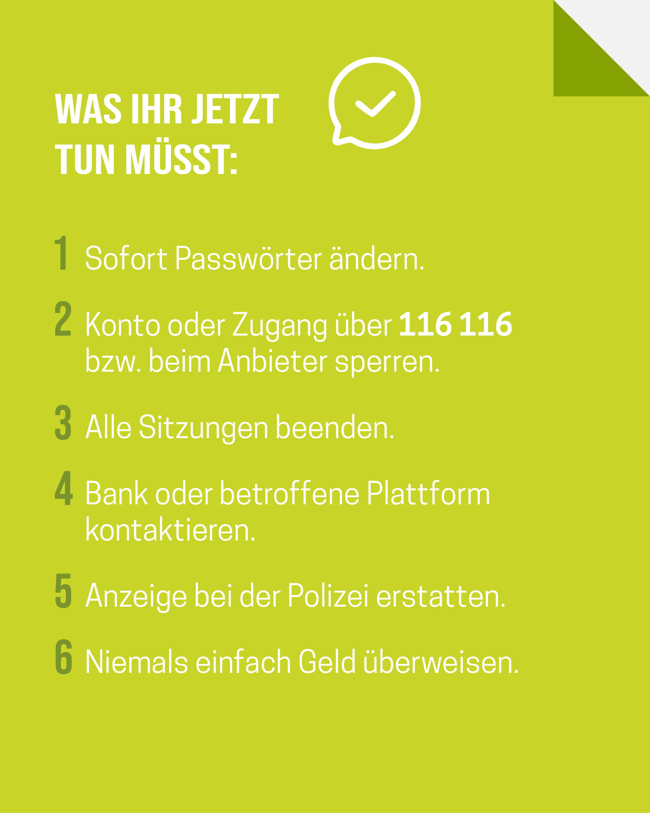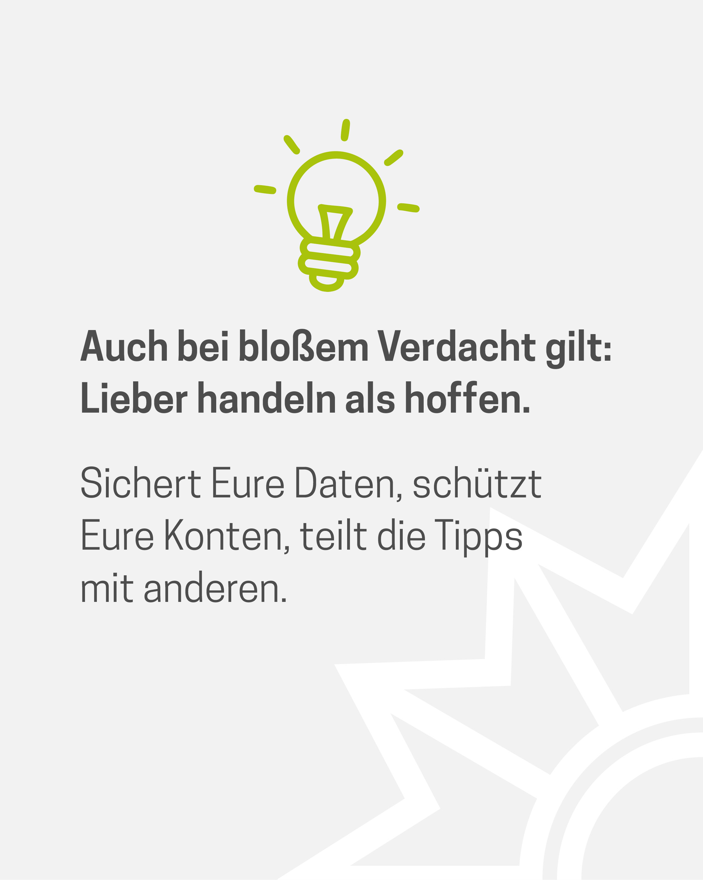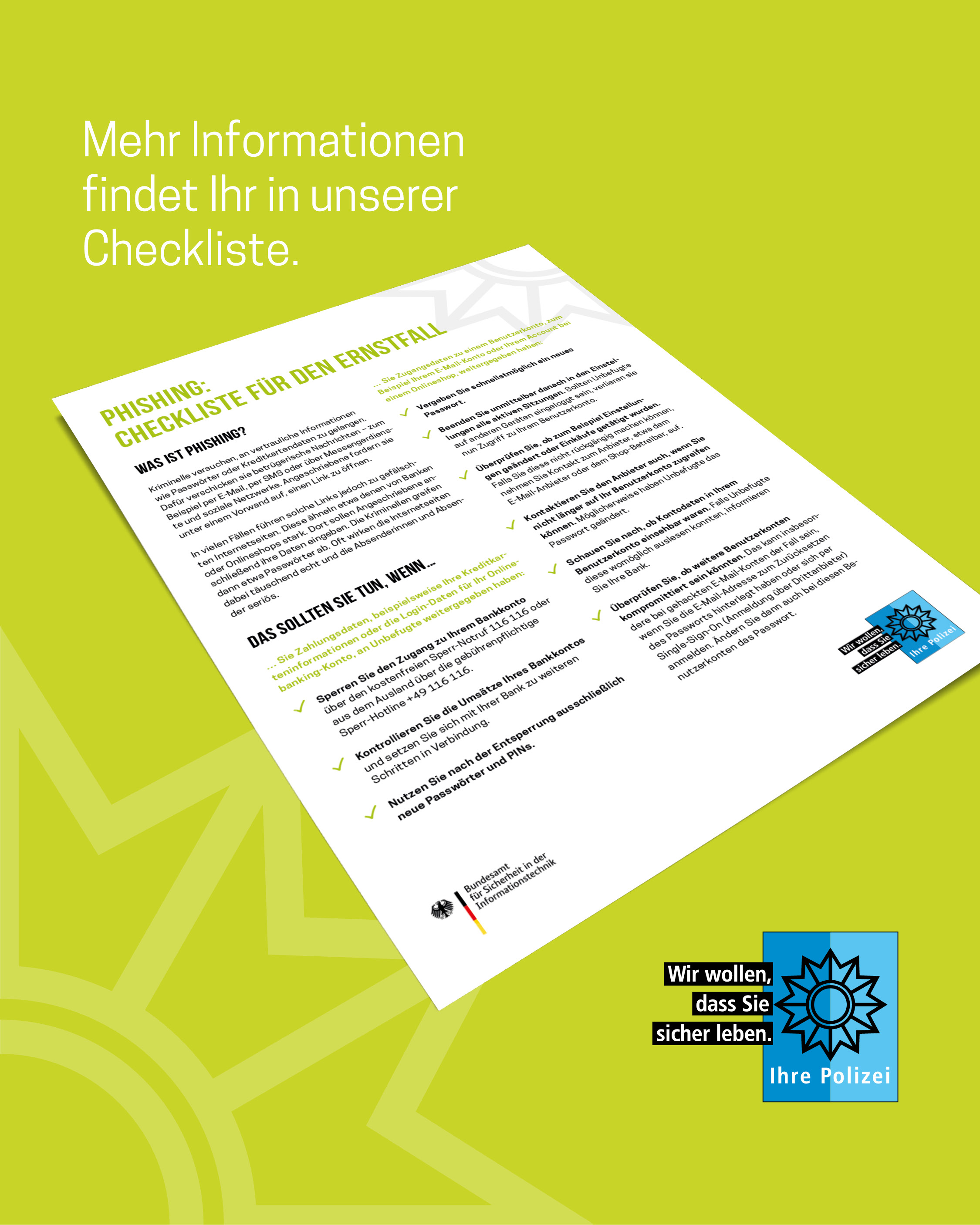 Das Medienpaket „Phishing Angriff auf Euer Smartphone? So reagiert Ihr richtig!“ ist eine thematische Zusammenstellung aus Bild- und/ oder Textpostings für die Social Media Kanäle Facebook, Instagram und X. Wir stellen Ihnen die Beiträge zur freien Verfügung bereit. Nutzen Sie diese selbst oder leiten Sie die Postings an Ihre zuständige Social Media Stelle weiter. Wie und ob Sie die Beiträge veröffentlichen, können Sie individuell entscheiden. Texte und Hashtags können Sie frei nutzen und für Ihre Anforderungen anpassen.