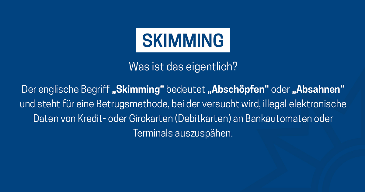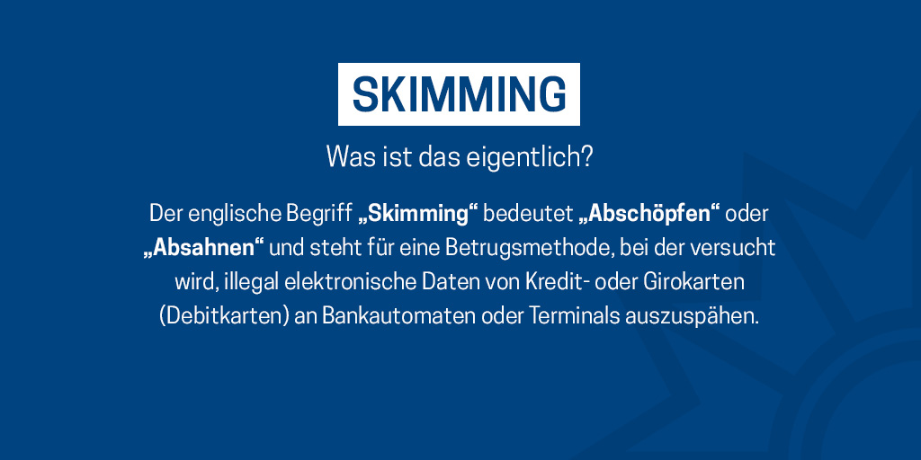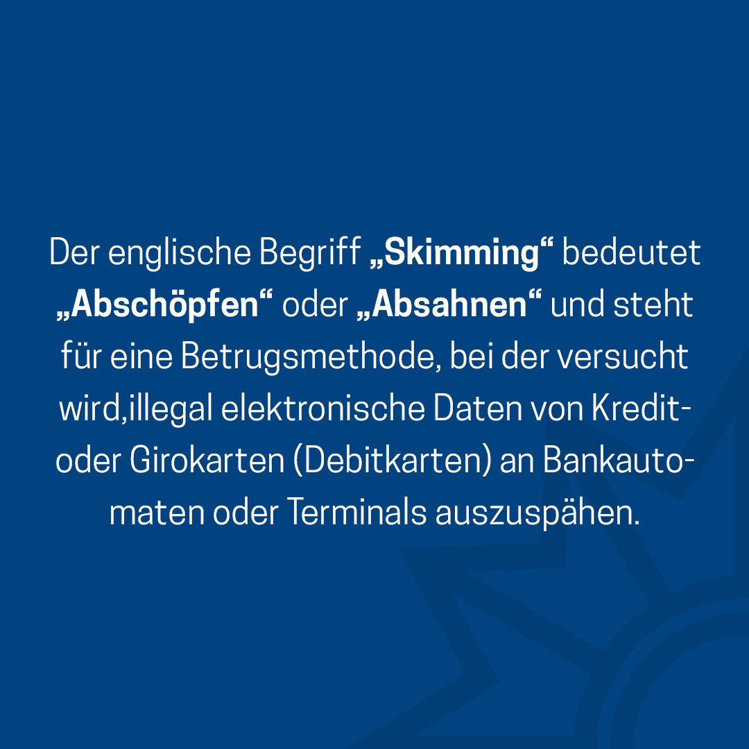 Das Medienpaket „Skimming: Was ist das eigentlich?“ ist eine thematische Zusammenstellung aus Bild- und/ oder Textpostings für die Social Media Kanäle Facebook, Instagram und X. Wir stellen Ihnen die Beiträge zur freien Verfügung bereit. Nutzen Sie diese selbst oder leiten Sie die Postings an Ihre zuständige Social Media Stelle weiter. Wie und ob Sie die Beiträge veröffentlichen, können Sie individuell entscheiden. Texte und Hashtags können Sie frei nutzen und für Ihre Anforderungen anpassen.