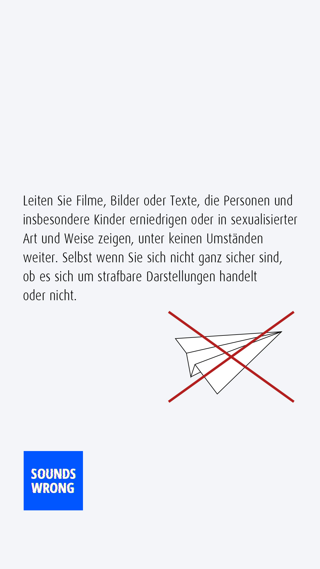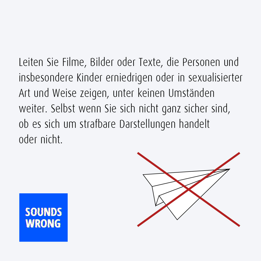 Das Medienpaket „Sounds Wrong: Erklärfilm Teil 2 - Missbrauchsdarstellungen erkennen“ ist eine thematische Zusammenstellung aus Bild- und/ oder Textpostings für die Social Media Kanäle Facebook, Instagram und X. Wir stellen Ihnen die Beiträge zur freien Verfügung bereit. Nutzen Sie diese selbst oder leiten Sie die Postings an Ihre zuständige Social Media Stelle weiter. Wie und ob Sie die Beiträge veröffentlichen, können Sie individuell entscheiden. Texte und Hashtags können Sie frei nutzen und für Ihre Anforderungen anpassen.