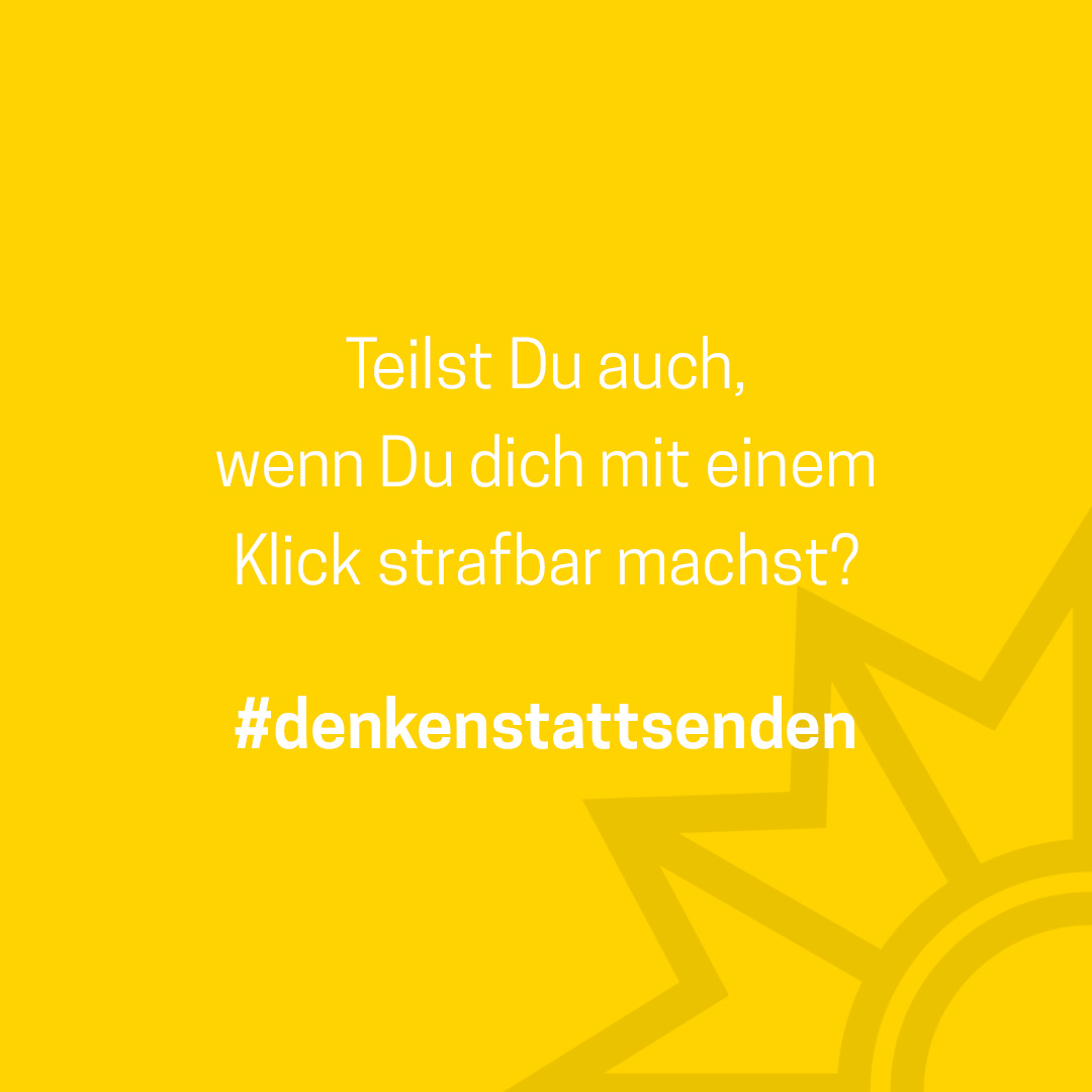 Das Medienpaket „#denkenstattsenden - Kampagne gegen die Verbreitung von Kinderpornografie Clip 4“ ist eine thematische Zusammenstellung aus Bild- und/ oder Textpostings für die Social Media Kanäle Facebook, Instagram und X. Wir stellen Ihnen die Beiträge zur freien Verfügung bereit. Nutzen Sie diese selbst oder leiten Sie die Postings an Ihre zuständige Social Media Stelle weiter. Wie und ob Sie die Beiträge veröffentlichen, können Sie individuell entscheiden. Texte und Hashtags können Sie frei nutzen und für Ihre Anforderungen anpassen.