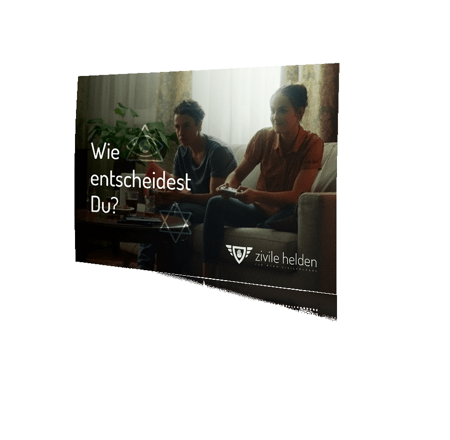 Die Infokarte zur Kampagne "Zivile Helden" bewirbt die interaktiven Filme auf www.zivile-helden.de, insbesondere den Film zum Thema Antisemitismus in Verschwörungsmythen. Zielgruppe sind junge, internetaffine Menschen. Der Film richtet sich speziell an die Altersgruppe der 18- bis 24-Jährigen. Über einen QR-Code auf der Infokarte gelangen Sie direkt zu "Chris+Lea". Im interaktiven Video "Chris+Lea" können Sie in die Rolle einer Schülergruppe schlüpfen. In ca. neun Minuten können Sie sich selbst testen, Zivilcourage zeigen und evtl. einen antisemitsch motivierten Brandanschlag verhindern.