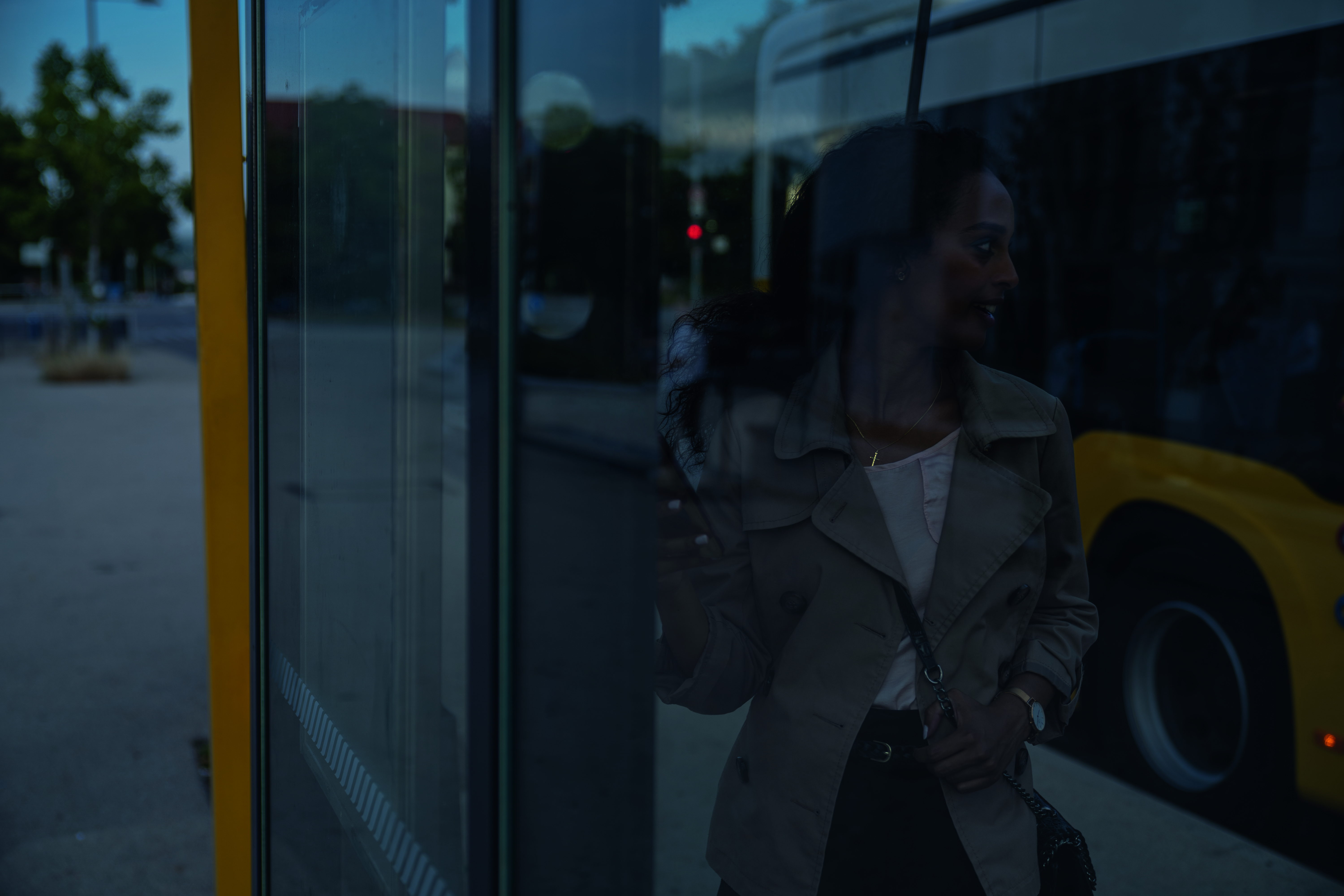 Frau an Bushaltestelle