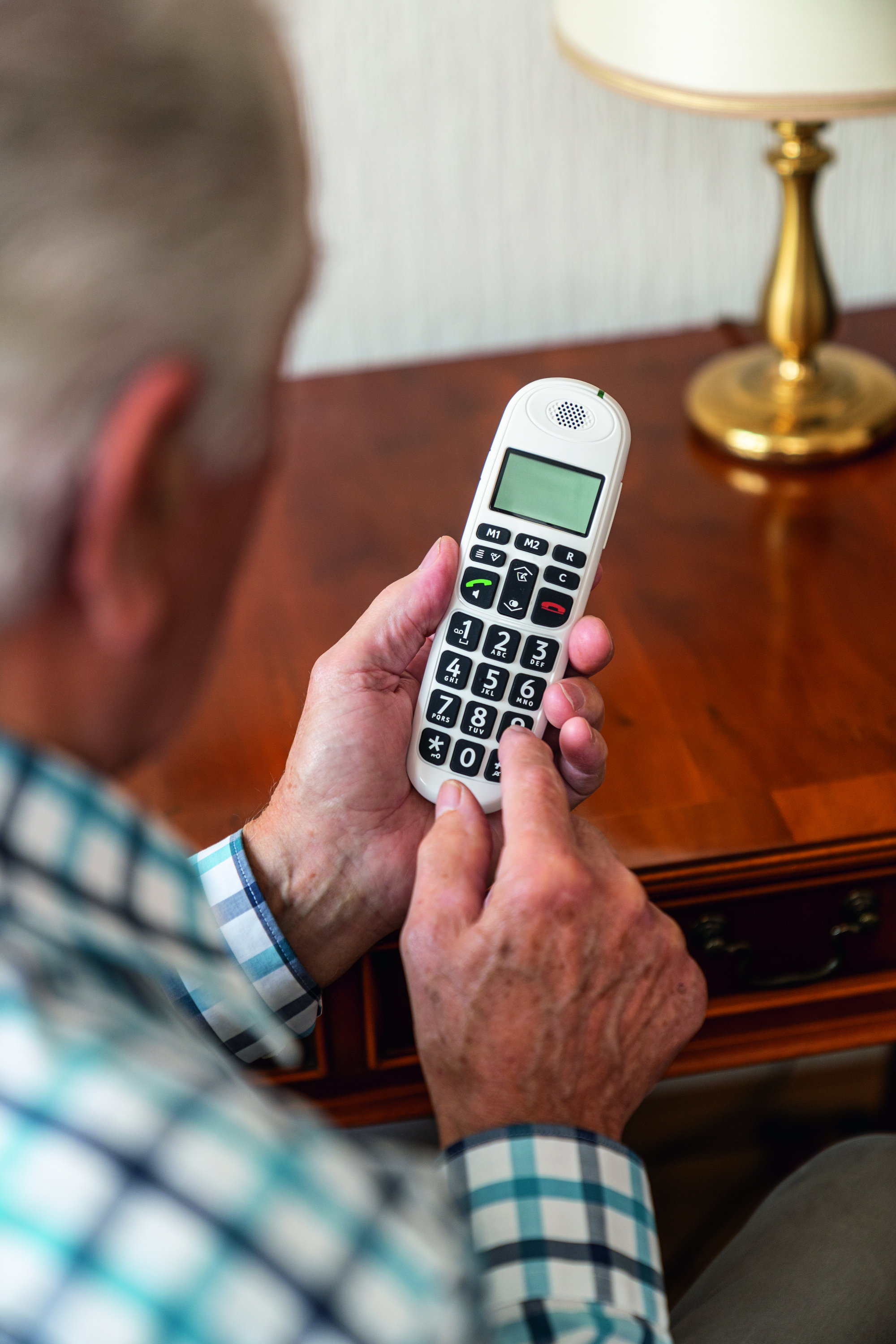 Alter Mann mit Telefon in der Hand