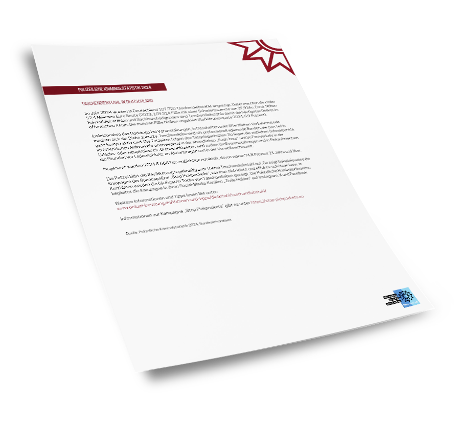 Unser Faltblatt "Schlauer gegen Klauer!" informiert, wie Taschendiebe vorgehen und in welchen Situationen eine erhöhte Gefahr von Taschendiebstahl besteht. Darüber hinaus sind die wichtigesten Tipps zur Vorbeugung dargestellt. Verhaltensempfehlungen für den Ernstfall sind ebenfalls aufgeführt. Das Faltblatt "Sicherheit rund um ihren Urlaub" bietet Reisenden und Urlaubern vielfältige Informationen, wie sie sich bei einer Reise vor Betrügern und Dieben schützen können. Sie erfahren, was Sie bei Reisebuchungen im Internet beachten sollten und welche Vorkehrungen vor der Abreise empfehlenswert sind. Auch sind Tipps zum Diebstahl-Schutz für die Anreise mit einem privaten Fahrzeug sowie per Zug, Bus, Schiff oder Flugzeug zu finden. Mit der Infografik "Taschendiebstahl in Deutschland" haben Sie schnell alle wichtigen Daten und Fakten der Polizeilichen Kriminalprävention im Blick.