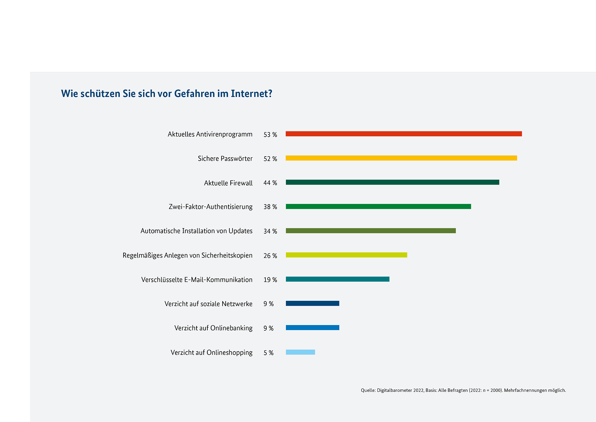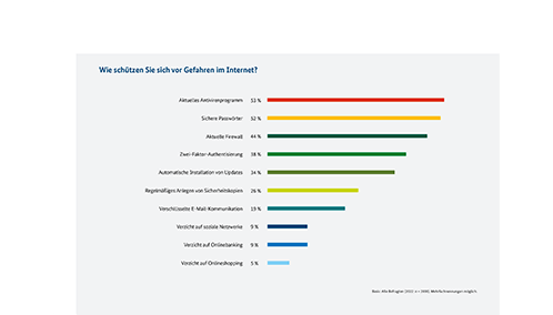 Auch hinsichtlich des Schutzverhaltens vor Gefahren im Internet setzt sich im Vergleich zum Vorjahr ein leichter Trend zu mehr Sorglosigkeit weiter fort. Die große Mehrheit der Befragten kennt dabei Schutzmaßnahmen.
