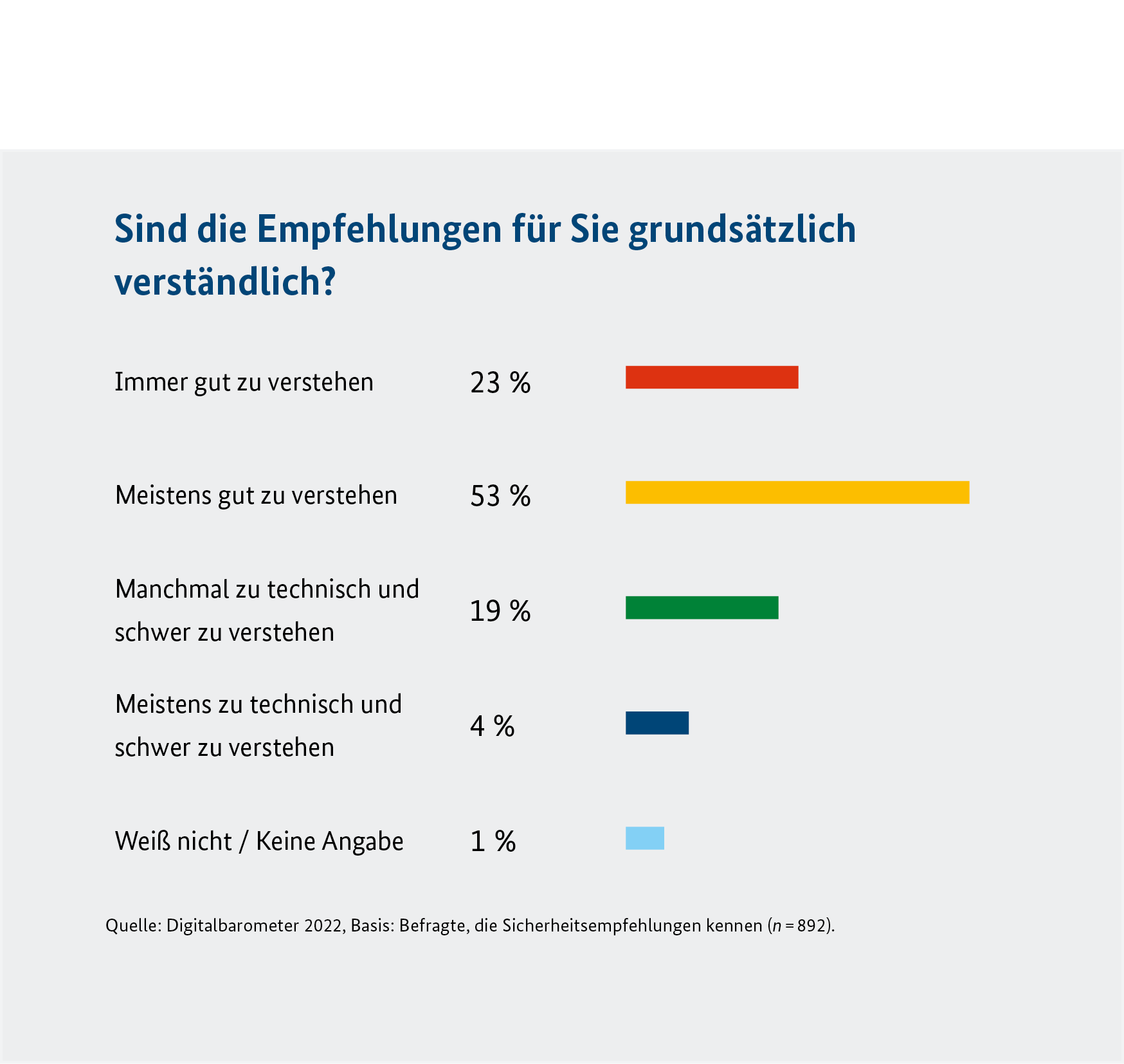 Entsprechend am wichtigsten sind Informationssuchenden weiterhin Tipps für den Ernstfall (51%), Erkennungszeichen von Kriminalität im Internet (49%) und Anleitungen zur präventiven Absicherung (46%). Die Funktionsweisen von Technologien haben dagegen konstant geringere Relevanz (stabil 22%).