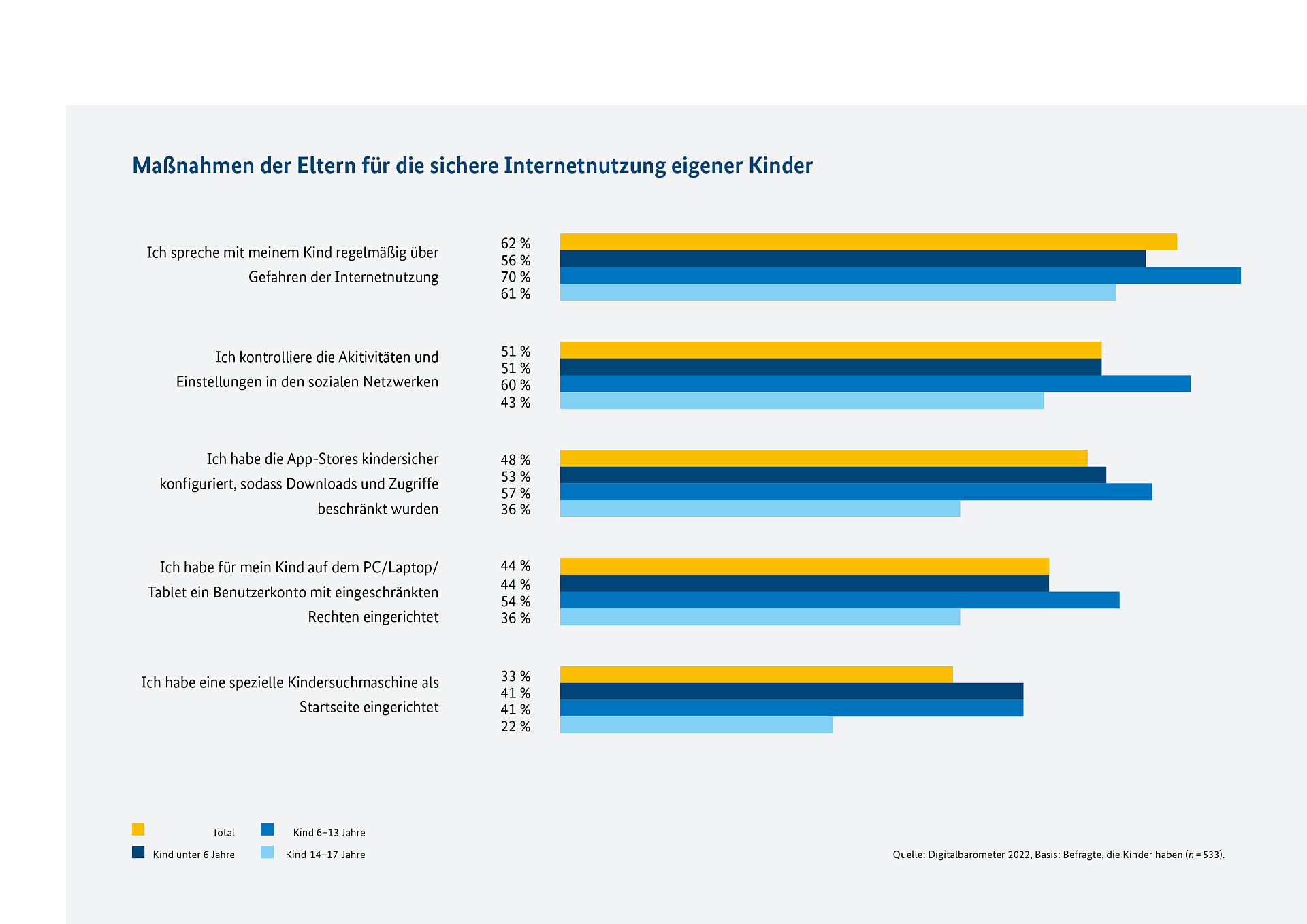 Eine Kernerkenntnis ist, dass weniger als ein Drittel der Eltern ihre Kinder vor dem Kauf internetfähiger Geräte über Cybersicherheitsrisiken aufklärt. Wenn Gespräche über IT-Sicherheit stattfinden, konzentrieren sie sich altersabhängig auf verschiedene Aspekte: Bei jüngeren Kindern (unter 6 Jahren) stehen oft erlaubte Webseiten und Apps im Vordergrund. Mit Kindern zwischen 6 und 17 Jahren werden hingegen am häufigsten über Cybergrooming gesprochen (51% der Eltern bei 6-13-Jährigen; 53% bei 14-17-Jährigen) sowie der Umgang mit unangemessenen Inhalten thematisiert. Technische Schutzmaßnahmen wie das Absichern eigener Accounts oder das Erkennen von Onlinebetrug werden seltener besprochen. Dies betrifft beispielsweise nur 31% der Eltern von 6-13-Jährigen und 41% der Eltern von 14-17-Jährigen, wenn es um das Absichern von Accounts geht.