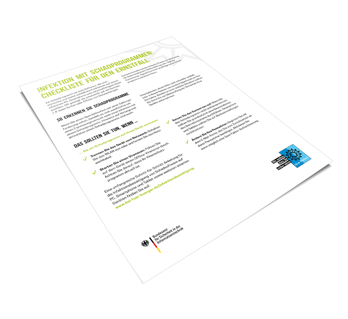Cyberkriminelle nutzen Schadsoftware (u.a. auch sogenannte Ransomware) für Datendiebstahl, Betrug und digitale Erpressung. Die Checkliste für den Fall einer Infektion mit Schadprogrammen vermittelt wirksame Tipps, um sich vor Datenverlust und anderen Folgen zu schützen. Sie wurde gemeinsam mit dem Bundesamt für Sicherheit in der Informationstechnik (BSI) und der Polizei entwickelt und bietet umsetzbare Empfehlungen zum Schutz von Rechnern und Smartphones.
