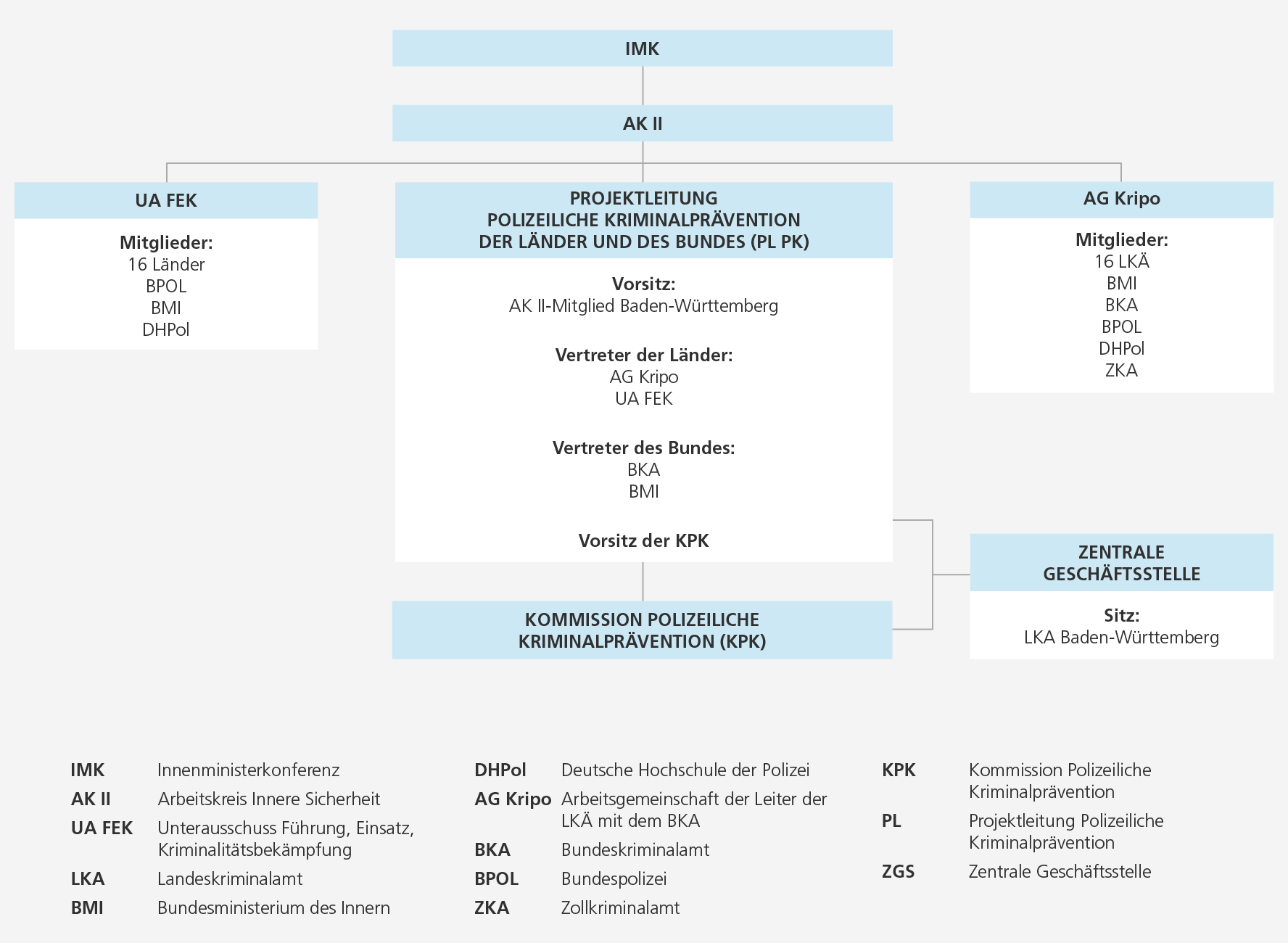 Die Präventionsarbeit der Polizei ist länderübergreifend organisiert und unterhalb des Arbeitskreises "Innere Sicherheit" (AK II) angesiedelt. Die jetzige Struktur wurde 1997 mit der Einrichtung einer Zentralen Geschäftsstelle verankert, die die Zusammenarbeit aller Bundesländer und des Bundes unterstützt. Gemeinsam setzen die Länder und der Bund das Programm Polizeiliche Kriminalprävention bundesweit um.